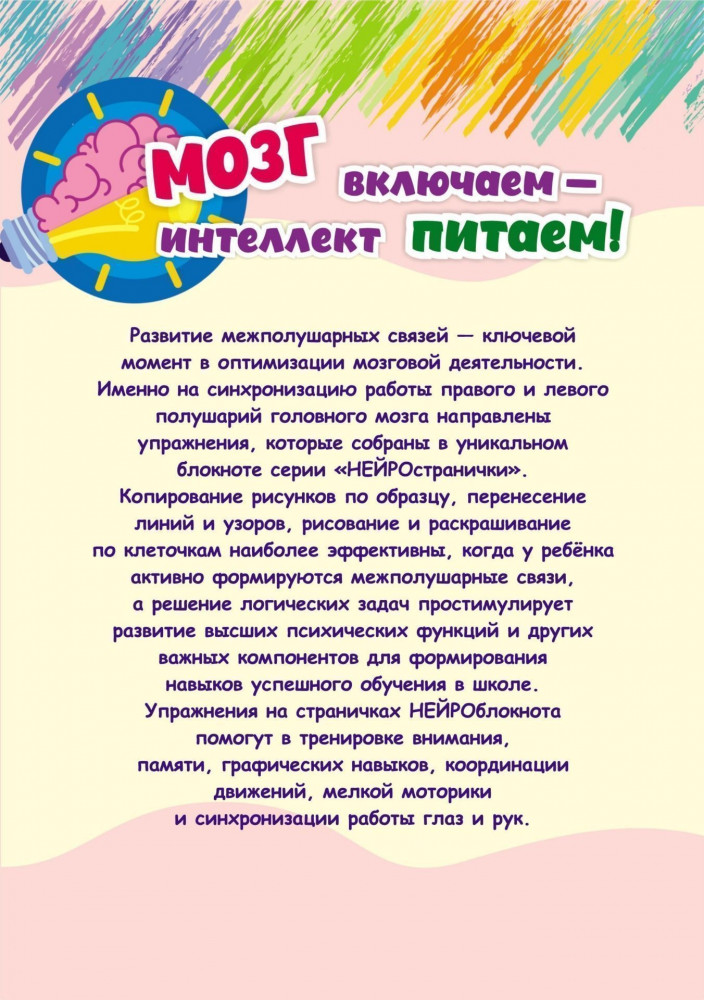 💳 Оплатить за товар можно при получении 🇰🇿 Есть бесплатная доставка по Казахстану от 1 дня 🎁 Копите бонусы с каждой покупки Серия: Нейространички Блокноты из серии «НЕЙРОстранички» разработаны специально для оптимизации мозговой деятельности детей от 6 до 10 лет. В блокнотах «Дружные полушария», «Неразлучные полушария», «Слаженные полушария» и «Гармоничные полушария» собраны интересные и эффективные задания, которые помогут «подружиться» полушариям головного мозга, сформировать новые нейронные связи, а также развить воображение, память, внимание, мелкую моторику, речь и зрительное восприятие. Раскрашивание по перевернутому и зашумленному образцу, рисование по цифрам и буквам, зеркальное раскрашивание, двуручное рисование, решение логических задач простимулируют развитие высших психических функций и других важных компонентов для формирования навыков успешного обучения в школе. |