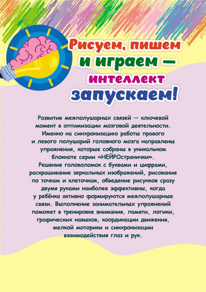 💳 Оплатить за товар можно при получении 🇰🇿 Есть бесплатная доставка по Казахстану от 1 дня 🎁 Копите бонусы с каждой покупки Серия: Нейространички Блокноты из серии «НЕЙРОстранички» разработаны специально для оптимизации мозговой деятельности детей от 6 до 10 лет. В блокнотах «Дружные полушария», «Неразлучные полушария», «Слаженные полушария» и «Гармоничные полушария» собраны интересные и эффективные задания, которые помогут «подружиться» полушариям головного мозга, сформировать новые нейронные связи, а также развить воображение, память, внимание, мелкую моторику, речь и зрительное восприятие. Раскрашивание по перевернутому и зашумленному образцу, рисование по цифрам и буквам, зеркальное раскрашивание, двуручное рисование, решение логических задач простимулируют развитие высших психических функций и других важных компонентов для формирования навыков успешного обучения в школе. |