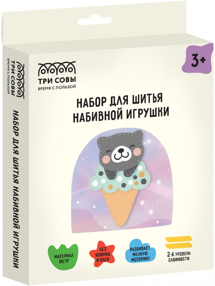 Работа над поделками из фетра — очень увлекательное занятие. С помощью набора для шитья игрушки бренда «Три Совы» без клея и ножниц ваш ребенок сможет сделать настоящее произведение искусства. В набор «Котик на мороженке» входит всё, что необходимо для работы. Это занятие не только способствует формированию усидчивости и терпению, воображения и внимания, но и развивает мелкую моторику рук и мышление.