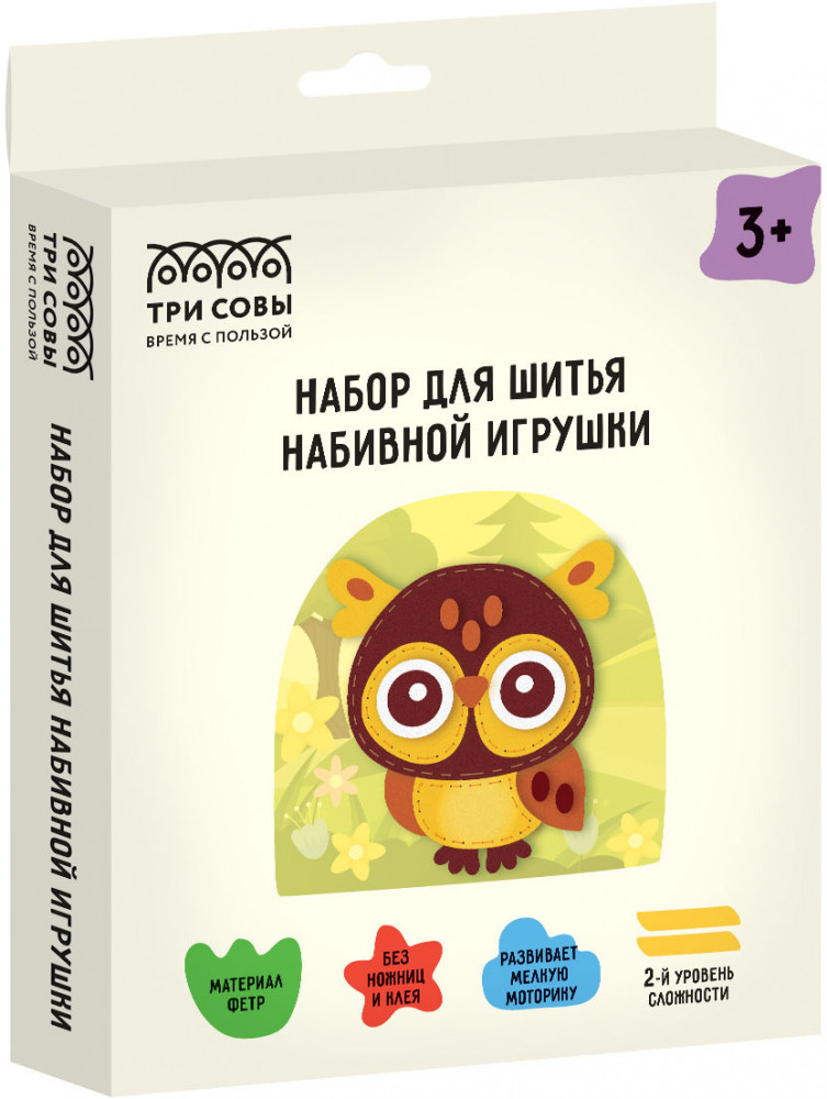 Работа над поделками из фетра — очень увлекательное занятие. С помощью набора для шитья игрушки бренда «Три Совы» без клея и ножниц ваш ребенок сможет сделать настоящее произведение искусства. В набор «Совёнок» входит всё, что необходимо для работы. Это занятие не только способствует формированию усидчивости и терпению, воображения и внимания, но и развивает мелкую моторику рук и мышление.