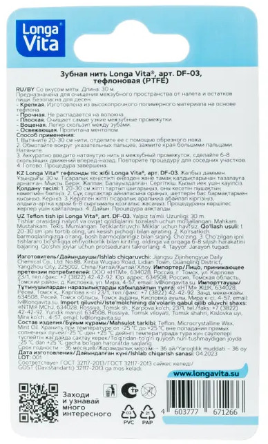 Longa Vita Зубная нить со вкусом мяты «Тефлоновая»-20% +51