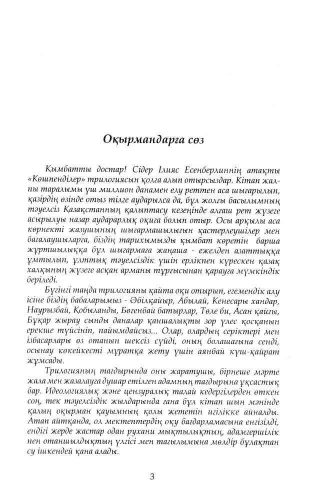 КөшпенділерВ данный момент этот товар отсутствует в продаже. Возможно, у нас найдется аналогичный или похожий товар здесь. Ілияс Есенберлиннің шығармашылығында атақты "Көшпенділер" трилогиясы негізгі орын алады, ол эпикалық құлаш-қарымымен, оқиғалардың серпінділігімен, қазақ тарихының жанды әрі қайталанбас тұлғаларының бейнесімен, тілінің шынайылығымен және айқындылығымен ерекшеленеді. |