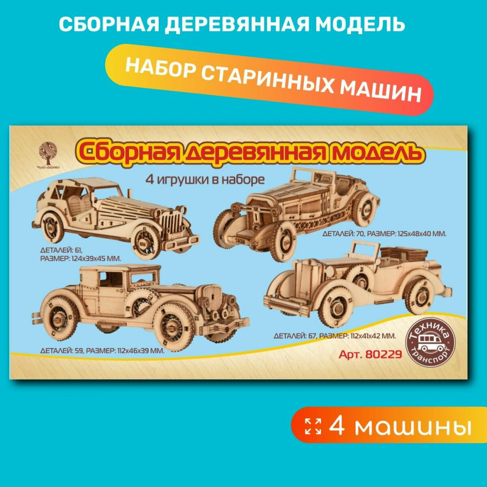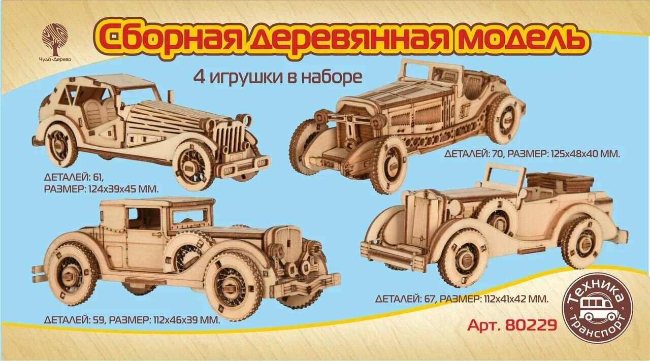Чудо-Дерево Модель сборная деревянная «Набор старинных автомобилей»В данный момент этот товар отсутствует в продаже. Возможно, у нас найдется аналогичный или похожий товар здесь. Деревянный конструктор из 4 ретро-автомобилей. Сборная деревянная модель позволит вместе с ребенком собрать объемную деревянную конструкцию. Конструктор из дерева включает в себя набор деталей, вырезанных на фанерных листах; схема сборки; наждачная бумага. Детали пазла скрепляются в порядке и очередности, обозначенной в инструкции. Для прочности соединений рекомендуется использовать клей ПВА. Модель для сборки развивает мелкую моторику, интеллектуальные способности, воображение и конструктивное мышление, тренирует терпение и усидчивость. |
