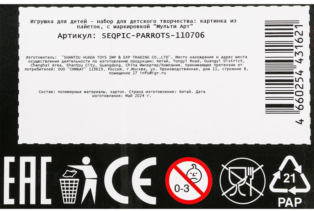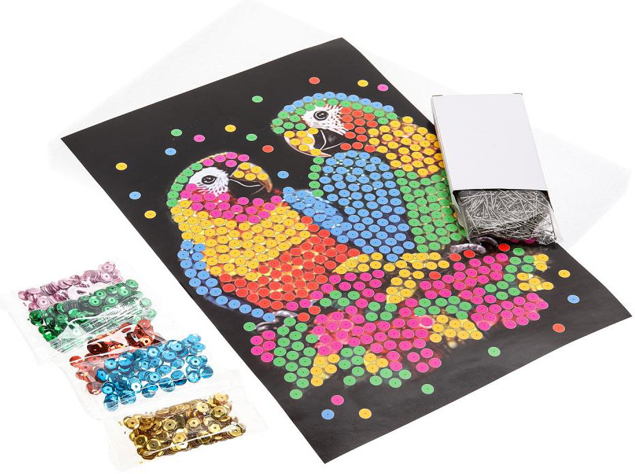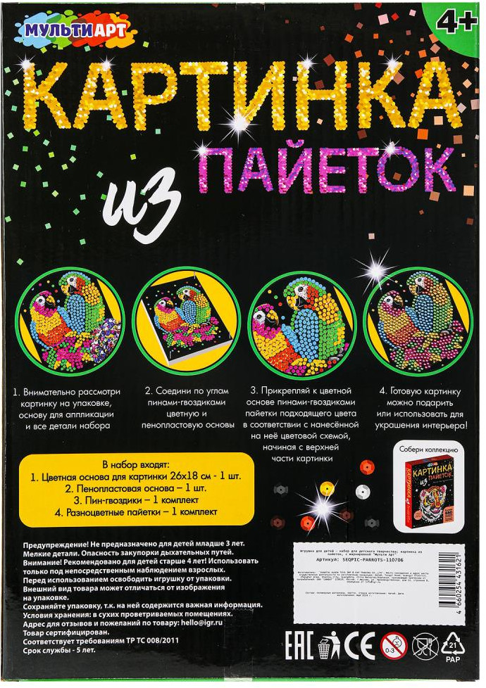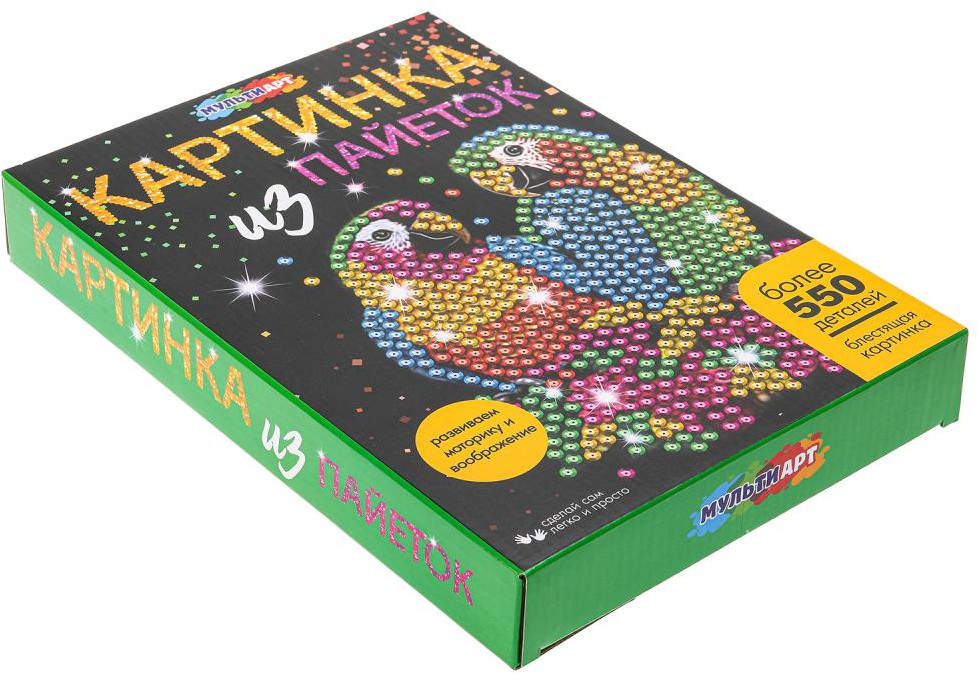 Multi Art Картина из пайеток «Попугаи»В данный момент этот товар отсутствует в продаже. Возможно, у нас найдется аналогичный или похожий товар здесь. Набор для творчества — картина из пайеток с гвоздиками «Попугаи» ТМ «Мульти Арт» — отличный подарок для маленького художника. С помощью красочной основы и сверкающих пайеток, прикрепляемых к ней гвоздиками, ребёнок сможет самостоятельно создать красивую блестящую картину с изображением ярких попугаев. Готовую поделку можно подарить близким или использовать для украшения интерьера. Занятия с наборами для творчества ТМ «Мульти Арт» развивают: внимание и усидчивость, творческое мышление, воображение, сенсорное, цветовое восприятие, моторику рук и воображение. |
