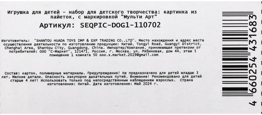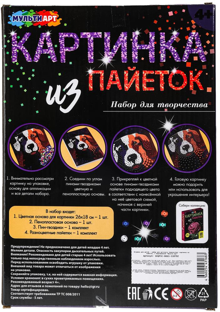 💳 Оплатить за товар можно при получении 🇰🇿 Есть бесплатная доставка по Казахстану от 1 дня 🎁 Копите бонусы с каждой покупки Набор для творчества — картина из пайеток с гвоздиками «Собака» ТМ «Мульти Арт» — отличный подарок для маленького художника. С помощью красочной основы и сверкающих пайеток, прикрепляемых к ней гвоздиками, ребёнок сможет самостоятельно создать красивую блестящую картину с изображением ярких попугаев. Готовую поделку можно подарить близким или использовать для украшения интерьера. Занятия с наборами для творчества ТМ «Мульти Арт» развивают: внимание и усидчивость, творческое мышление, воображение, сенсорное, цветовое восприятие, моторику рук и воображение. |