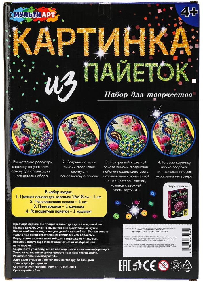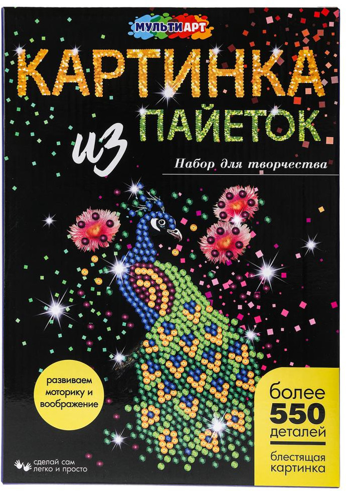 Multi Art Картина из пайеток «Павлин»В данный момент этот товар отсутствует в продаже. Возможно, у нас найдется аналогичный или похожий товар здесь. Набор для творчества — картина из пайеток с гвоздиками «Павлин» ТМ «Мульти Арт» — отличный подарок для маленького художника. С помощью красочной основы и сверкающих пайеток, прикрепляемых к ней гвоздиками, ребёнок сможет самостоятельно создать красивую блестящую картину с изображением ярких попугаев. Готовую поделку можно подарить близким или использовать для украшения интерьера. Занятия с наборами для творчества ТМ «Мульти Арт» развивают: внимание и усидчивость, творческое мышление, воображение, сенсорное, цветовое восприятие, моторику рук и воображение. |