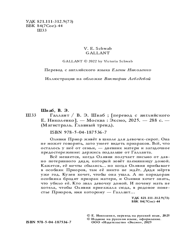 💳 Оплатить за товар можно при получении 🇰🇿 Есть бесплатная доставка по Казахстану от 1 дня 🎁 Копите бонусы с каждой покупки Серия: Магистраль. Главный тренд Оливия Приор живёт в школе для девочек-сирот. Она не может говорить, зато умеет видеть призраков. Всё, что осталось у неё от семьи — дневник матери и загадочное предостережение: держись подальше от Галланта. |