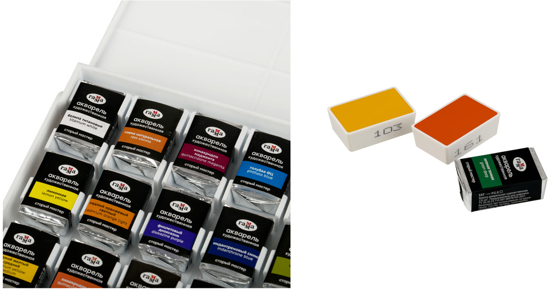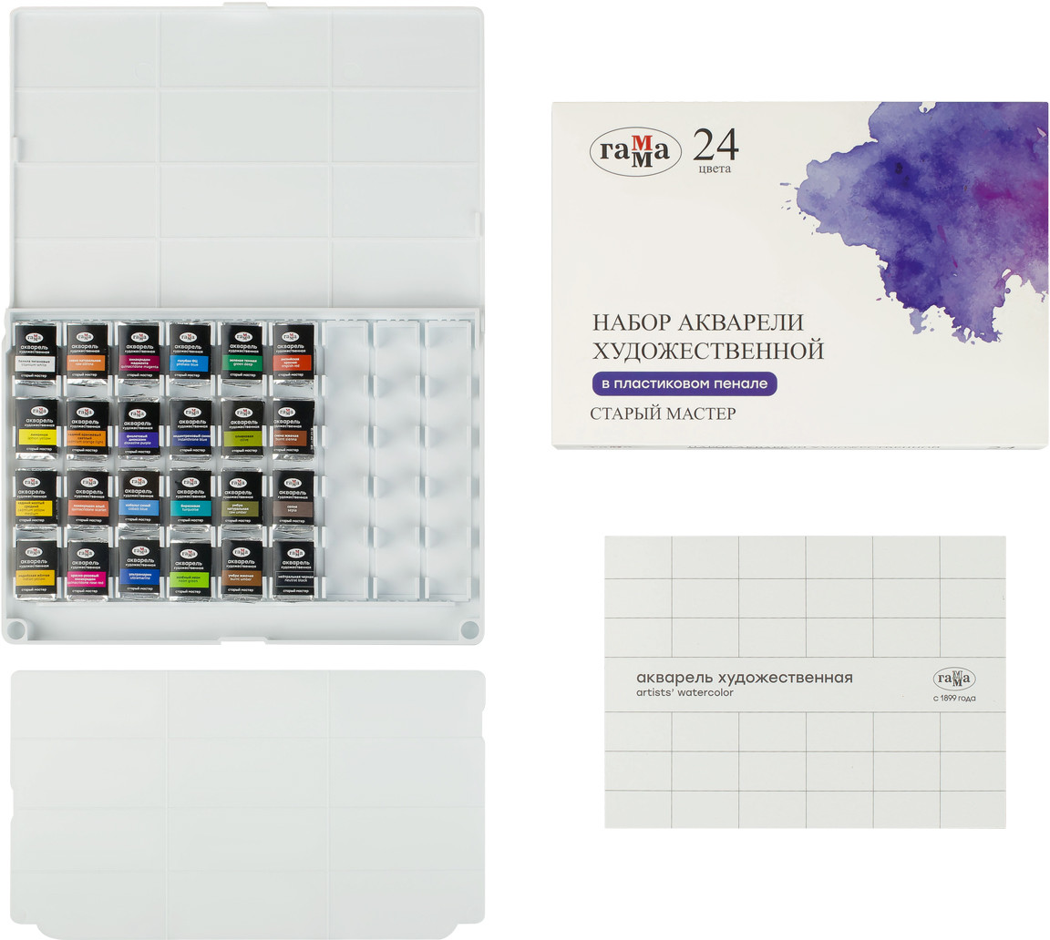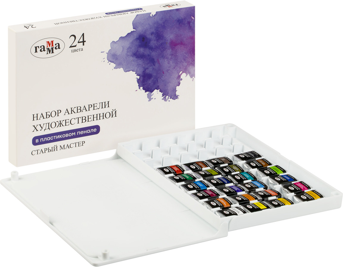 Профессиональная художественная акварель «ГАММА» серии «Старый мастер» разработана в собственной исследовательской лаборатории завода. Профессиональные краски состоят из тонкодисперсных пигментов, связующего, в состав которого входит раствор растительного клея — гуммиарабика высшей степени очистки, что обеспечивает насыщенность цветов, чистоту и прозрачность красочного слоя. Акварель «Старый мастер» изготавливается без использования дополнительных наполнителей, а многослойная заливка увеличивает долю пигмента. Краски обладают высоким уровнем светостойкости. С помощью акварельных красок «ГАММА» серии «Старый мастер» можно писать в различных техниках, например, — лессировка, по — мокрому, заливка, сухая кисть.