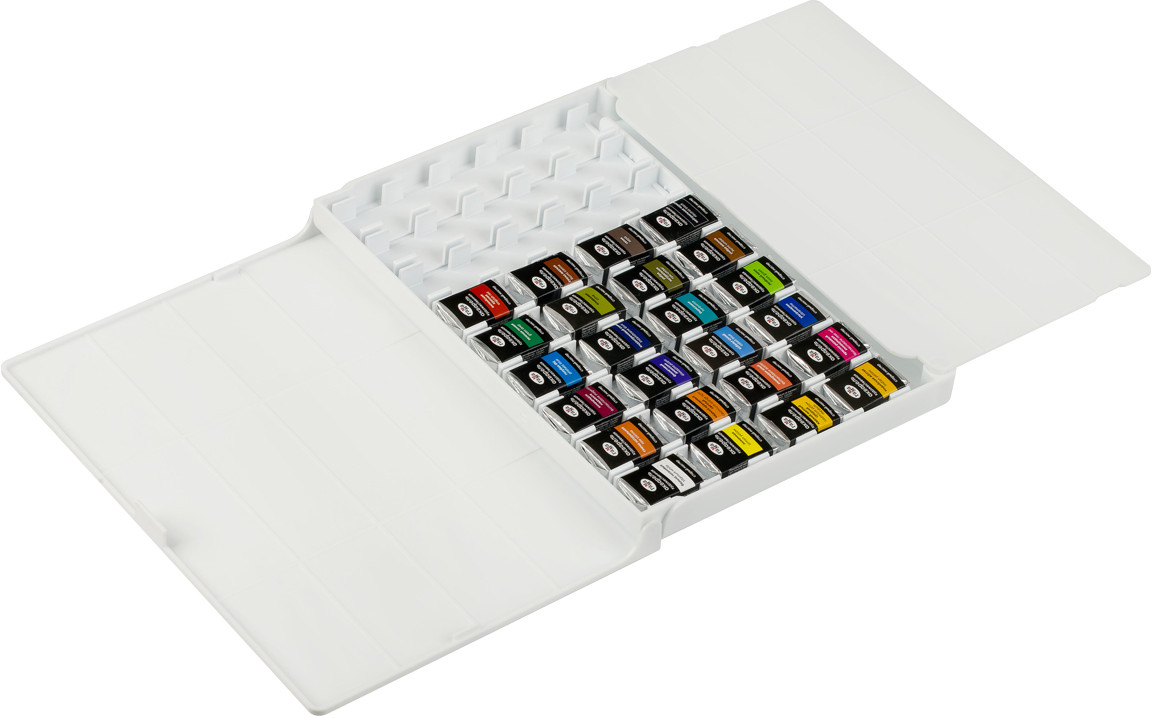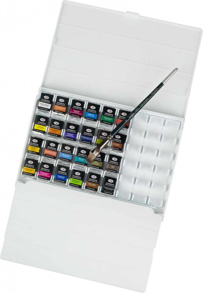 Набор представлен в пластиковом пенале с удобными креплениями кювет, палитрой и также присутствует место под кисть. Такой формат удобен для пленэра или студии.