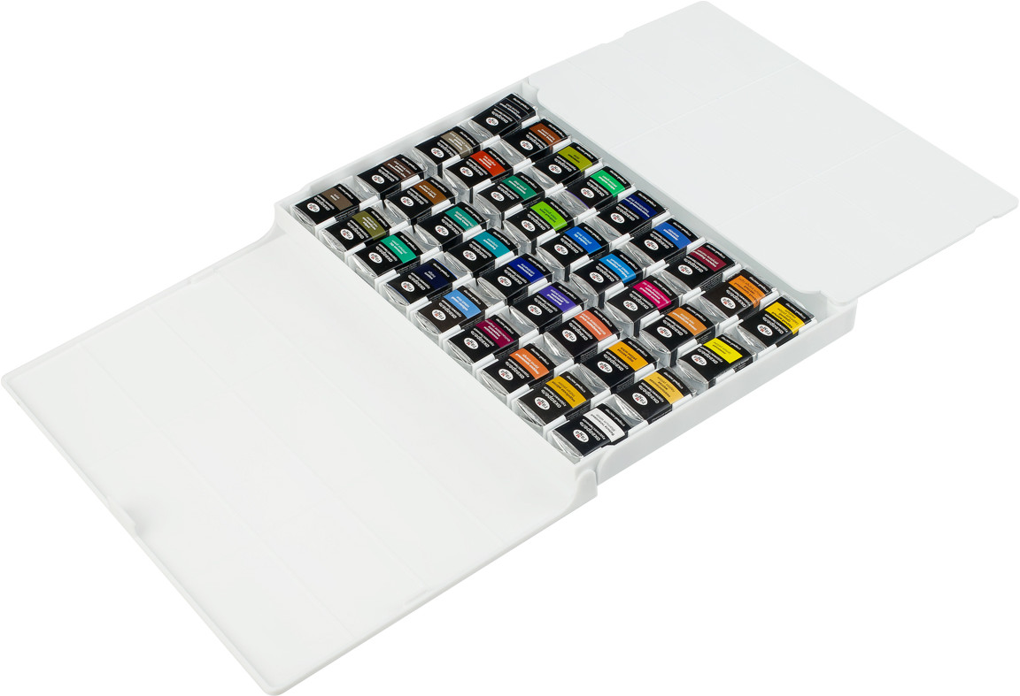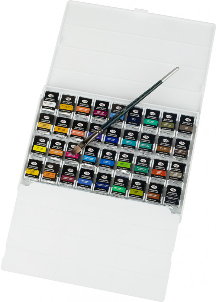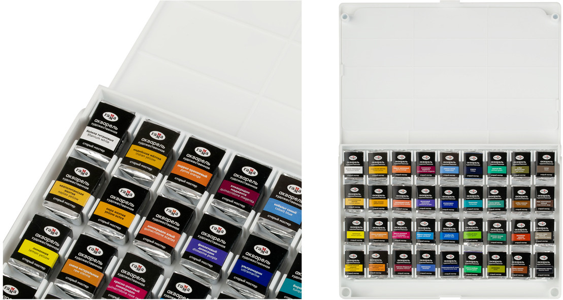 Набор представлен в пластиковом пенале с удобными креплениями кювет, палитрой и также присутствует место под кисть. Такой формат удобен для пленэра или студии.