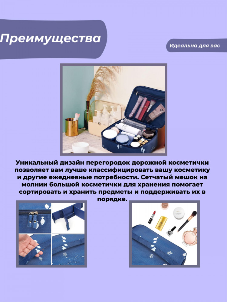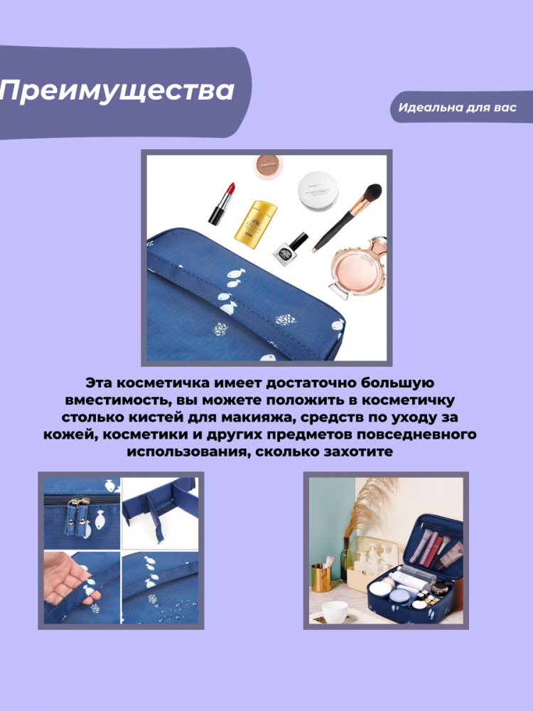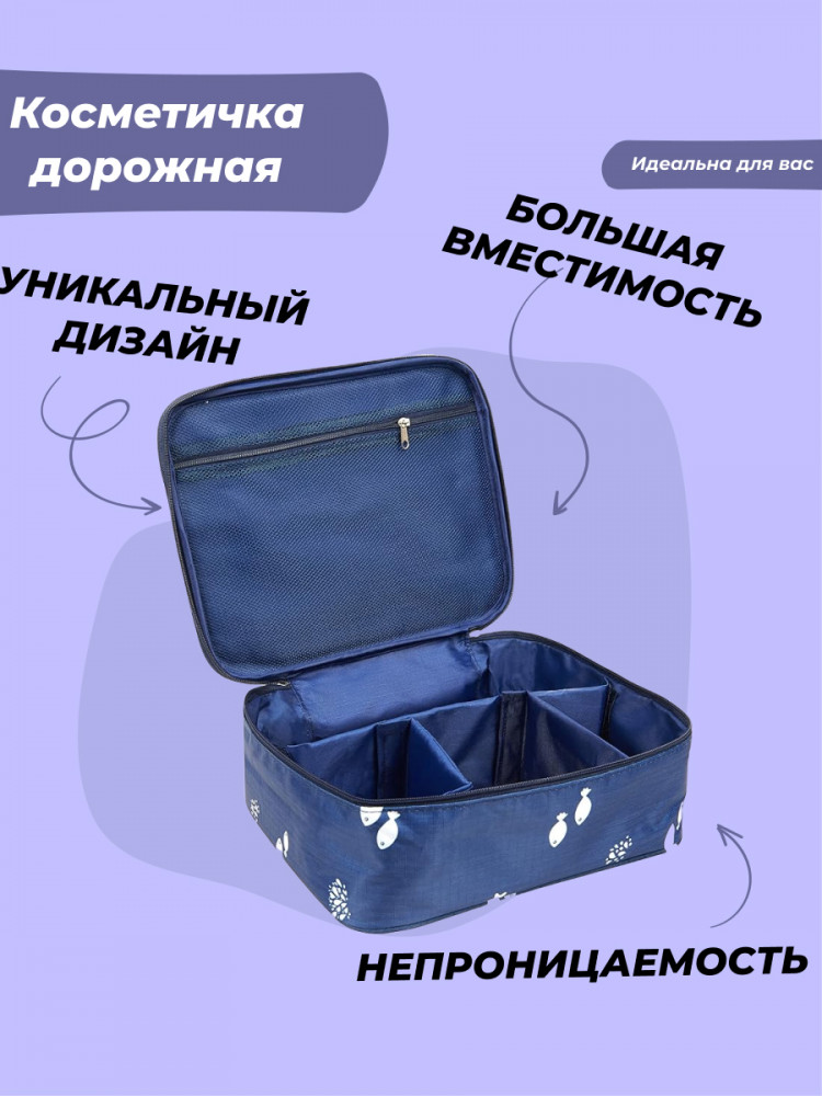 Держите всю косметику в одном месте! Большая дорожная косметичка органайзер из качественного водонепроницаемого материала. Прекрасный вариант для повседневного использования и незаменимая вещь в поездках на отдых, в командировки для мужчин и женщин. Прямоугольная форма позволяет компактно разместить её в дорожной сумке, в поездке на отдых всей семьей, когда экономия места имеет большое значение. Многие покупатели используют в качестве аптечки в поездках и дома. Нижнее отделение позволяет удобно разместить всю косметику: тональный крем, пудра, спреи, помада, блеск для губ, флаконы с различной косметикой. В верхней части несессера есть удобный карман из плотной сетки, прекрасно подойдет для кистей, карандашей, тюбиков с кремами, помады. Легко стирается, материал при стирке не теряет цвет и водоотталкивающих свойств.