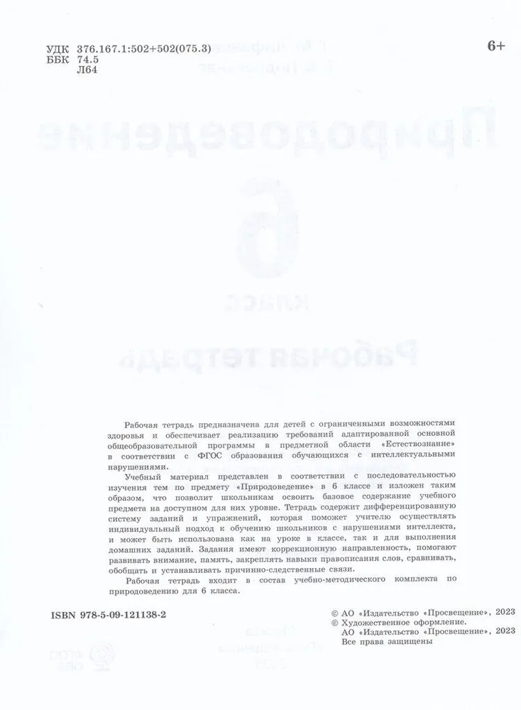 Учебный материал представлен в соответствии с последовательностью изучения тем по предмету «Природоведение» в 6 классе и изложен таким образом, что позволит школьникам освоить базовое содержание учебного предмета на доступном для них уровне. Тетрадь содержит дифференцированную систему заданий и упражнений, которая поможет учителю осуществлять индивидуальный подход к обучению школьников с нарушениями интеллекта, и может быть использована как на уроке в классе, так и для выполнения домашних заданий. Задания имеют коррекционную направленность, помогают развивать внимание, память, закреплять навыки правописания слов, сравнивать, обобщать и устанавливать причинно-следственные связи.