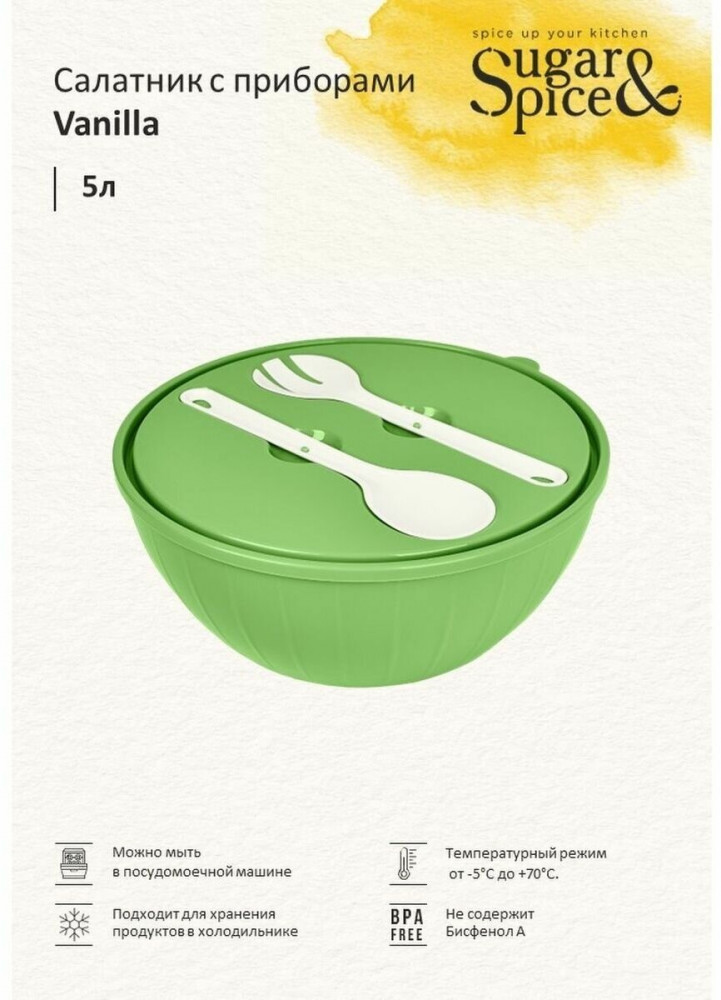 Sugar & Spice Салатник с крышкой и приборами «Vanilla»В данный момент этот товар отсутствует в продаже. Возможно, у нас найдется аналогичный или похожий товар здесь. Серия: Vanilla Салатник Sugar&Spice Vanilla с крышкой и приборами 5 л прекрасно подходит для приготовления и подачи различных блюд на стол. Легкий вес салатника облегчает транспортировку, его легко взять с собой на природу. Крышка плотно закрывается, сохраняя свежесть продуктов. С помощью удобного язычка на крышке салатник легко открывать. Декоративные ребра на корпусе придают изделию дополнительную прочность. Оптимальный объем 5 л подойдет как для большой компании, так и для семейного обеда. Приборы на крышке — уникальная деталь салатника. Вы можете перемешать содержимое, а при хранении приборы не потеряются, т.к. надежно крепятся к крышке. Изготовлен из безопасного пищевого пластика, который подходит для маринадов и горячего. Температурный режим: от −5°С до +70°С. |