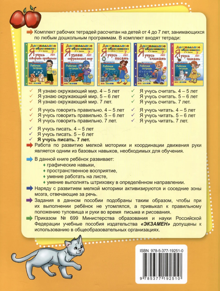 Я учусь писать. Рабочая тетрадь для детей 7 летСветлана Васильевна Конопля, Ольга Николаевна Крылова В данный момент этот товар отсутствует в продаже. Возможно, у нас найдется аналогичный или похожий товар здесь. Серия: Дошкольное образование Данное пособие полностью соответствует федеральному государственному образовательному стандарту дошкольного образования. Комплект рабочих тетрадей «Я учусь писать» рассчитан на детей от 4 до 7 лет, занимающихся по любым дошкольным программам. Основное назначение работы по тетради «Я учусь писать» — развитие мелкой моторики и координации движения рук, что является основной частью подготовки руки к письму и одним из базовых навыков, необходимых для обучения. В пособии подобраны упражнения, способствующие развитию у ребёнка графических навыков, развитию пространственного восприятия, умения работать на листе, выполнять штриховку в определённом направлении. Пособие рассчитано на воспитателей детских садов, методистов, а также родителей для занятий с детьми 7 лет. |