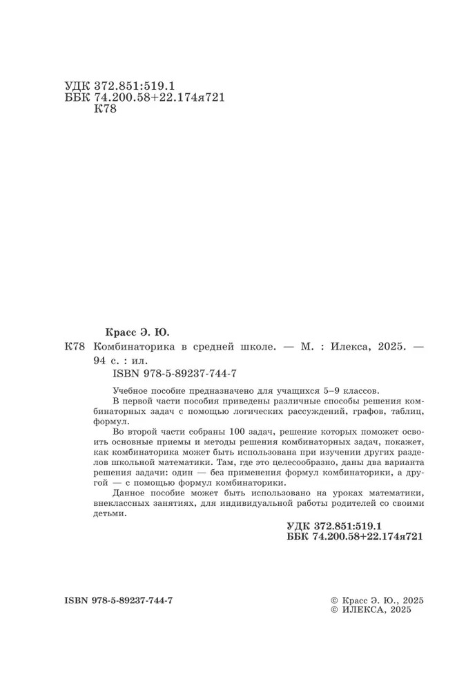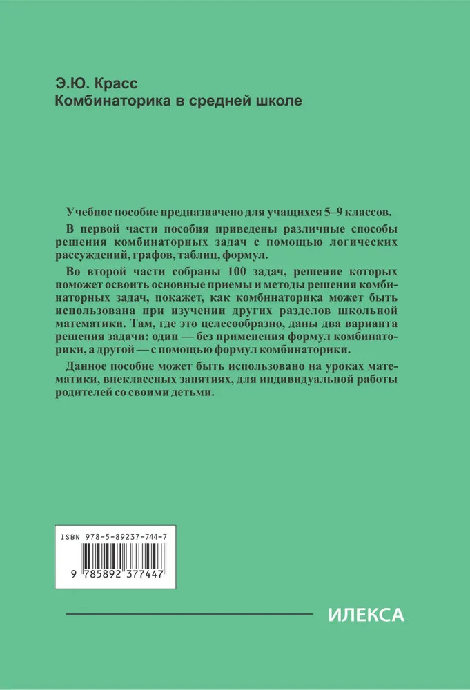 💳 Оплатить за товар можно при получении 🇰🇿 Есть бесплатная доставка по Казахстану от 1 дня 🎁 Копите бонусы с каждой покупки Учебное пособие предназначено для учащихся 5-9 классов. В первой части пособия приведены различные способы решения комбинаторных задач с помощью логических рассуждений, графов, таблиц, формул. Во второй части собраны 100 задач, решение которых поможет освоить основные приемы и методы решения комбинаторных задач, покажет, как комбинаторика может быть использована при изучении других разделов школьной математики. Там, где это целесообразно, даны два варианта решения задачи: один — без применения формул комбинаторики, а другой — с помощью формул комбинаторики. Данное пособие может быть использовано на уроках математики, внеклассных занятиях, для индивидуальной работы родителей со своими детьми. |