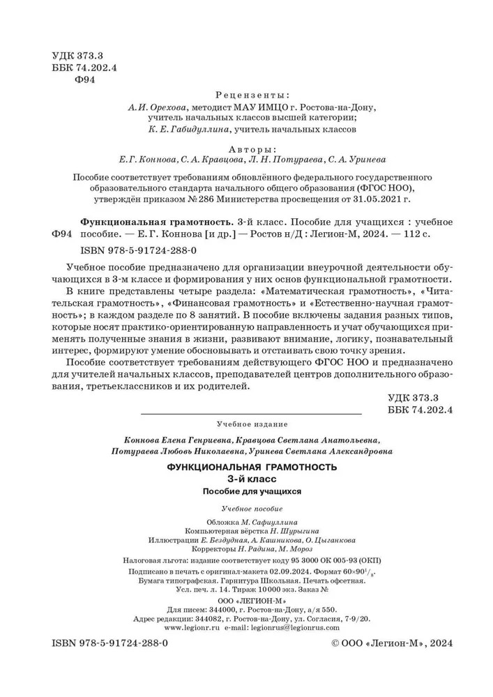 💳 Оплатить за товар можно при получении 🇰🇿 Есть бесплатная доставка по Казахстану от 1 дня 🎁 Копите бонусы с каждой покупки Серия: Функциональная грамотность. Тренажёр Учебное пособие предназначено для организации внеурочной деятельности обучающихся в 3-м классе и формирования у них основ функциональной грамотности. В книге представлены четыре раздела: «Математическая грамотность», «Читательская грамотность», «Финансовая грамотность» и «Естественно-научная грамотность»; в каждом разделе по 8 занятий. В пособие включены задания разных типов, которые носят практико-ориентированную направленность и учат обучающихся применять полученные знания в жизни, развивают внимание, логику, познавательный интерес, формируют умение обосновывать и отстаивать свою точку зрения. Пособие соответствует требованиям действующего ФГОС НОО и предназначено для учителей начальных классов, преподавателей центров дополнительного образования, третьеклассников и их родителей. |