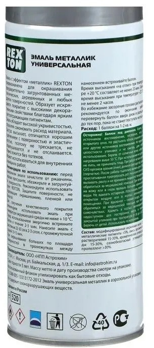 Краска-спрей металлик универсальная серебро — предназначена для окраски предварительно загрунтованных металлических, деревянных и прочих поверхностей. Применяется для наружных и внутренних работ. Быстросохнущая акриловая эмаль. Образует на поверхности металлизированное покрытие с глубоким искрящимся блеском, придавая окрашенному изделию эффектный декоративный вид.