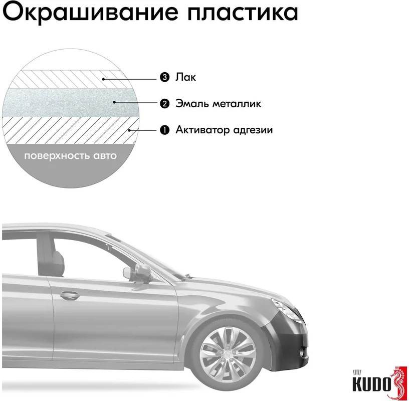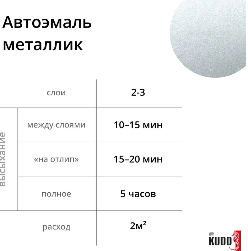 Высококачественная металлизированная базовая эмаль KUDO® воздушной сушки представляет собой суспензию эффектных и цветных пигментов в растворе полиэфирной, меламиновой смол и ацетобутирата целлюлозы с введением целевых добавок.