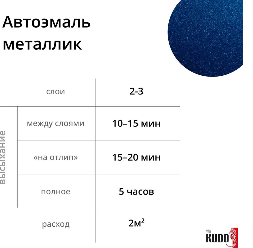 Высококачественная металлизированная базовая эмаль KUDO® воздушной сушки представляет собой суспензию эффектных и цветных пигментов в растворе полиэфирной, меламиновой смол и ацетобутирата целлюлозы с введением целевых добавок.