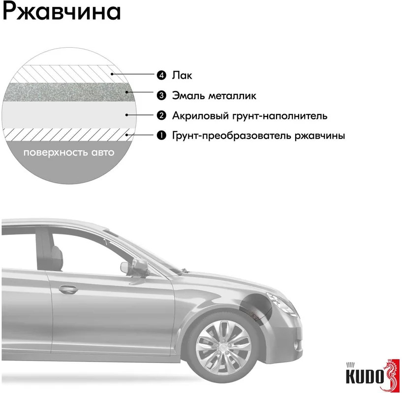 • эмаль не обладает поверхностной прочностью и атмосферостойкостью. Обязательно требуется нанесение защитного слоя прозрачного акрилового лака не ранее, чем через 15‑20 минут после нанесения последнего слоя эмали. Рекомендуется использовать автомобильный акриловый лак KUDO® KU-9010.