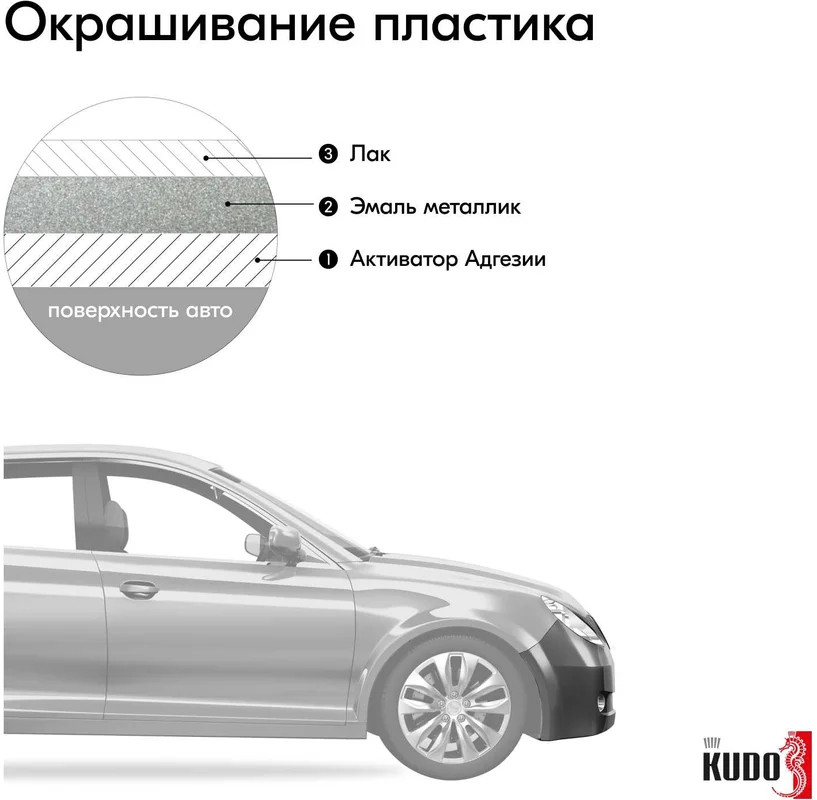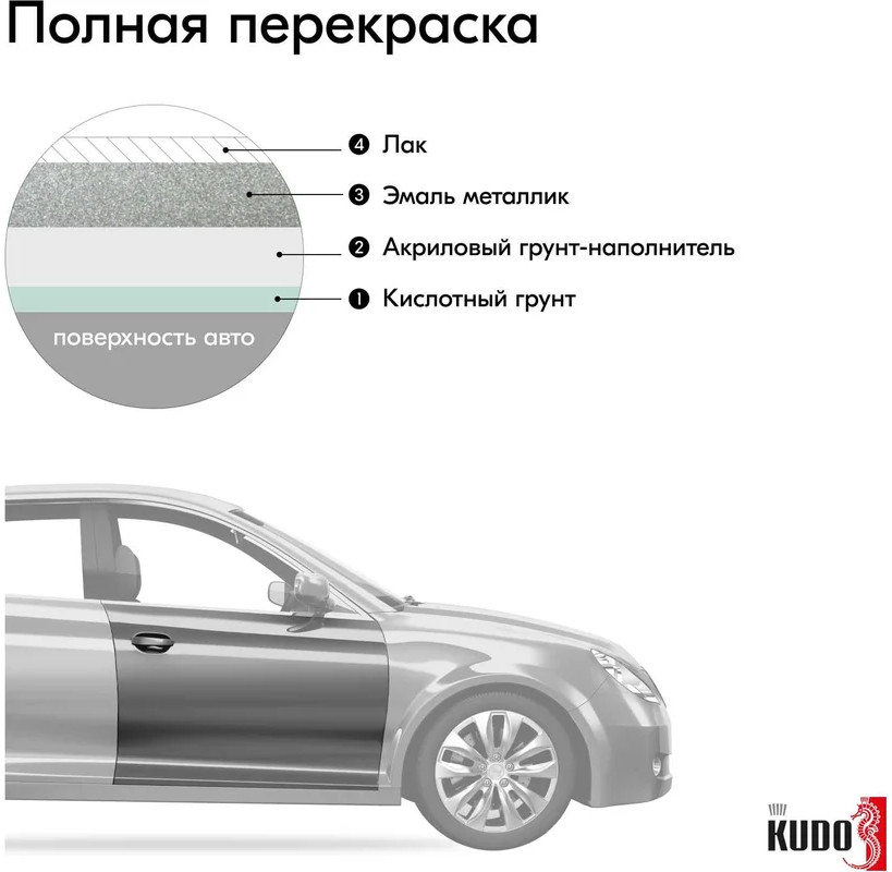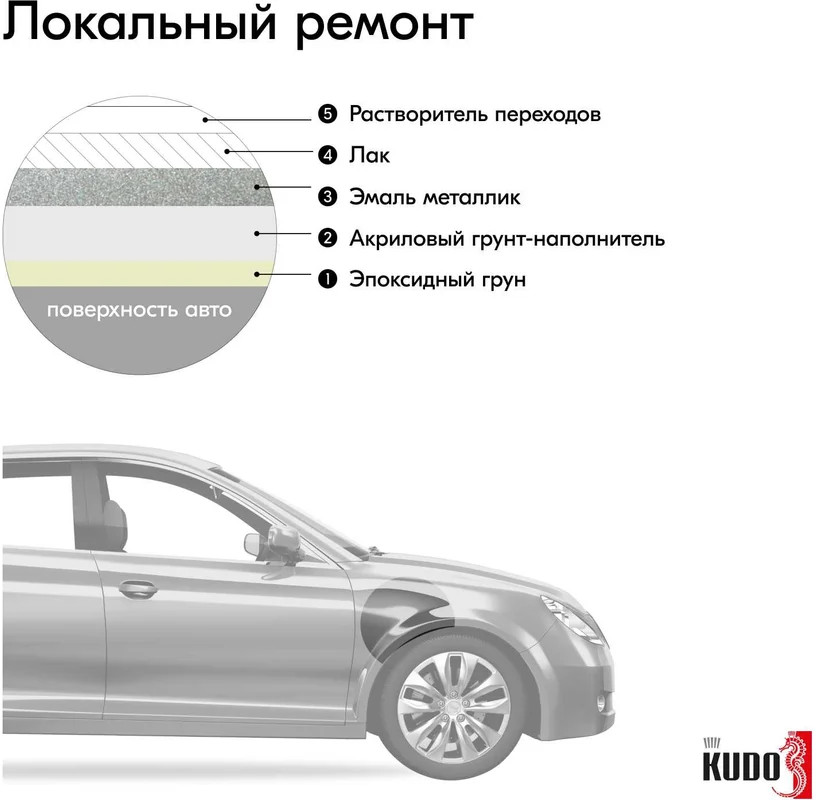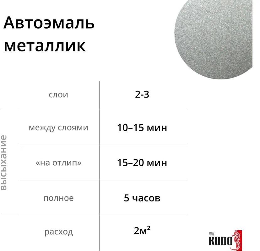 Высококачественная металлизированная базовая эмаль KUDO® воздушной сушки представляет собой суспензию эффектных и цветных пигментов в растворе полиэфирной, меламиновой смол и ацетобутирата целлюлозы с введением целевых добавок.