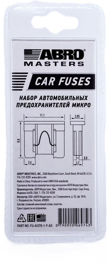 Предохранитель флажковый микро 7.5-30A ABRO Masters № 9 — Выполняют защитную функцию. Предохранитель защищает электрическую цепь и её элементы от перегрева и возгорания при протекании высокой силы тока. Плавкая вставка из высококачественных сплавов внутри предохранителя ABRO плавится при превышении определенной величины тока, предотвращая короткое замыкание далее по электрическим цепям. Материал корпуса плавкого предохранителя изготовлен из термостойкой пластмассы, которая не плавится при нагреве до определённой температуры.