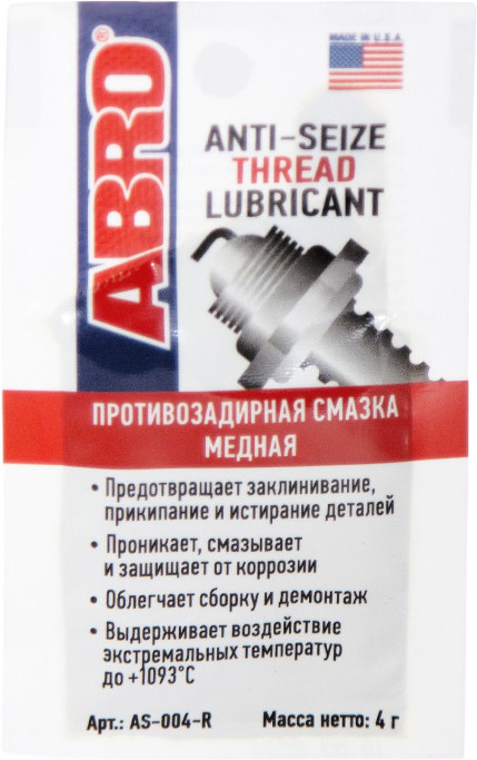 Смазка медная ABRO Masters противозадирная 4г блистер — предназначена для использования при высоких температурах и тяжелом режиме работы. Предотвращает истирание, заклинивание деталей и появление коррозии после сборки. Снижает износ при использовании в условиях высокого давления. Эффективно смазывает детали, подверженные воздействию высокого контактного давления и высоких температур.