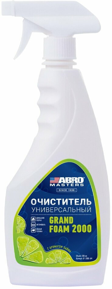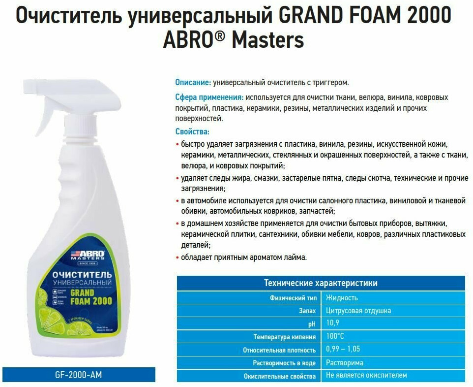 Очиститель универсальный «Grand Foam 2000» ABRO Masters 500 мл триггер — универсальный очиститель с триггером. Используется для очистки ткани, велюра, винила, ковровых покрытий, пластика, керамики, резины, металлических изделий и прочих поверхностей. Быстро удаляет загрязнения с пластика, винила, резины, искусственной кожи, керамики, металлических, стеклянных и окрашенных поверхностей, а также с ткани, велюра, и ковровых покрытий. Удаляет следы жира, смазки, застарелые пятна, следы скотча, технические и прочие загрязнения. В автомобиле используется для очистки салонного пластика, виниловой и тканевой обивки, автомобильных ковриков, запчастей. В домашнем хозяйстве применяется для очистки бытовых приборов, вытяжки, керамической плитки, сантехники, обивки мебели, ковров, различных пластиковых деталей. Имеет приятный аромат лайма.