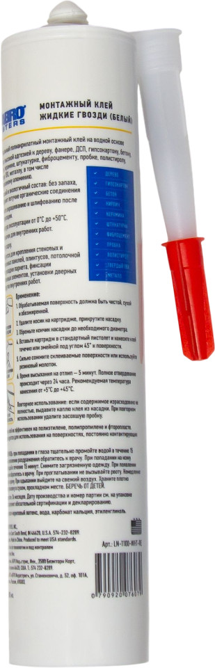 В данный момент этот товар отсутствует в продаже. Возможно, у нас найдется аналогичный или похожий товар здесь. Серия: Masters Клей монтажный жидкие гвозди ABRO Masters белый 280 мл — используется для крепления стеновых и изоляционных панелей, плинтусов, потолочной плитки, укладки паркета, фиксации декоративных элементов, установки дверных рам и других внутренних работ. Обладает высокой адгезией к дереву, фанере, ДСП, гипсокартону, бетону, кирпичу, керамике, штукатурке, фиброцементу, пробке, полистиролу, твердому ПВХ, металлу, в том числе анодированному алюминию. Безопасный и экологичный состав: без запаха, не содержит летучие органические соединения. Поддается окрашиванию и шлифованию после полимеризации. Температура эксплуатации от 0 до +50 °С. Предназначен для внутренних работ, не дает усадку. Используется совместно с монтажным пистолетом.