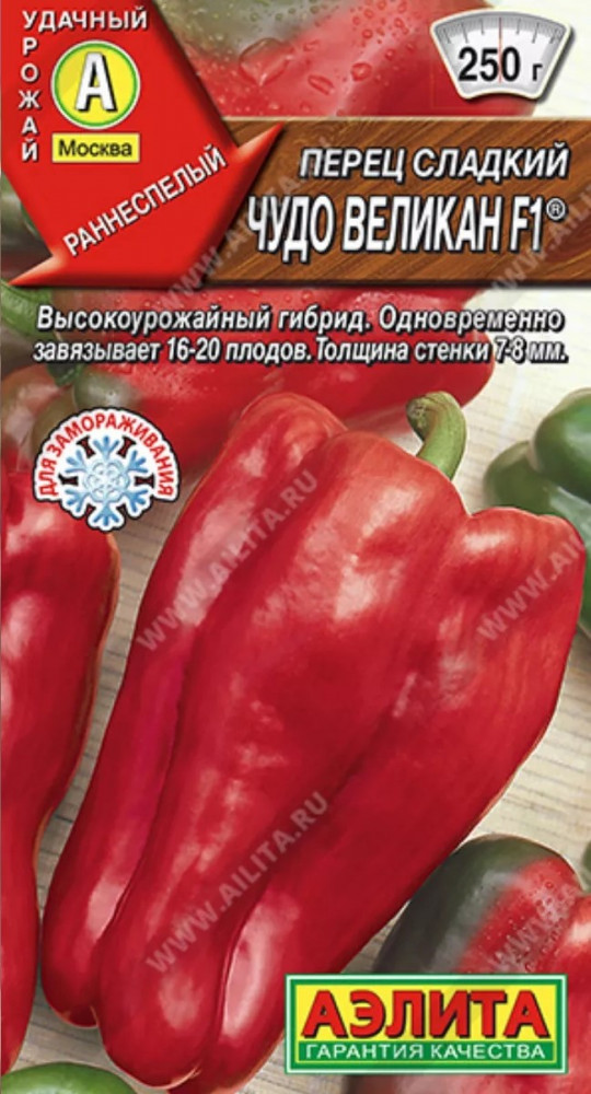 Раннеспелый гибрид, от всходов до плодоношения 110-115 дней. Предназначен для выращивания в открытом грунте и под пленочными укрытиями. Растения полураскидистые, высокие. Плоды призмовидные*, крупные, средней массой 180-250 г, с толстыми (7-8 мм) стенками. Вкусовые качества отличные, мякоть сочная, сладкая, с приятным ароматом. Рекомендуется для свежего потребления, кулинарной переработки, консервирования и замораживания. Урожайность под пленкой — 8-10 кг/ м2.