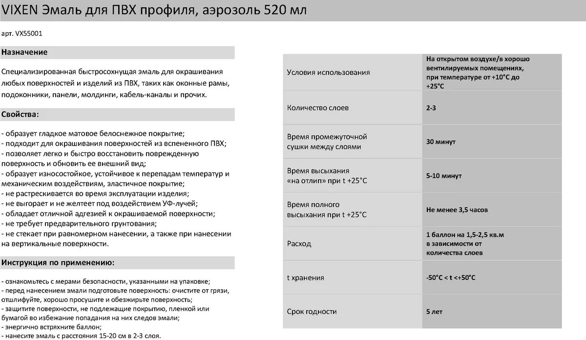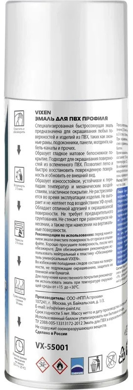 Краска белая для ПВХ профиля матовая аэрозоль — предназначена для окрашивания любых поверхностей и изделий из ПВХ, таких как оконные рамы, подоконники, панели, молдинги, кабель-каналы и прочих. Образует гладкое матовое белоснежное покрытие. Подходит для окрашивания поверхностей из вспененного ПВХ.