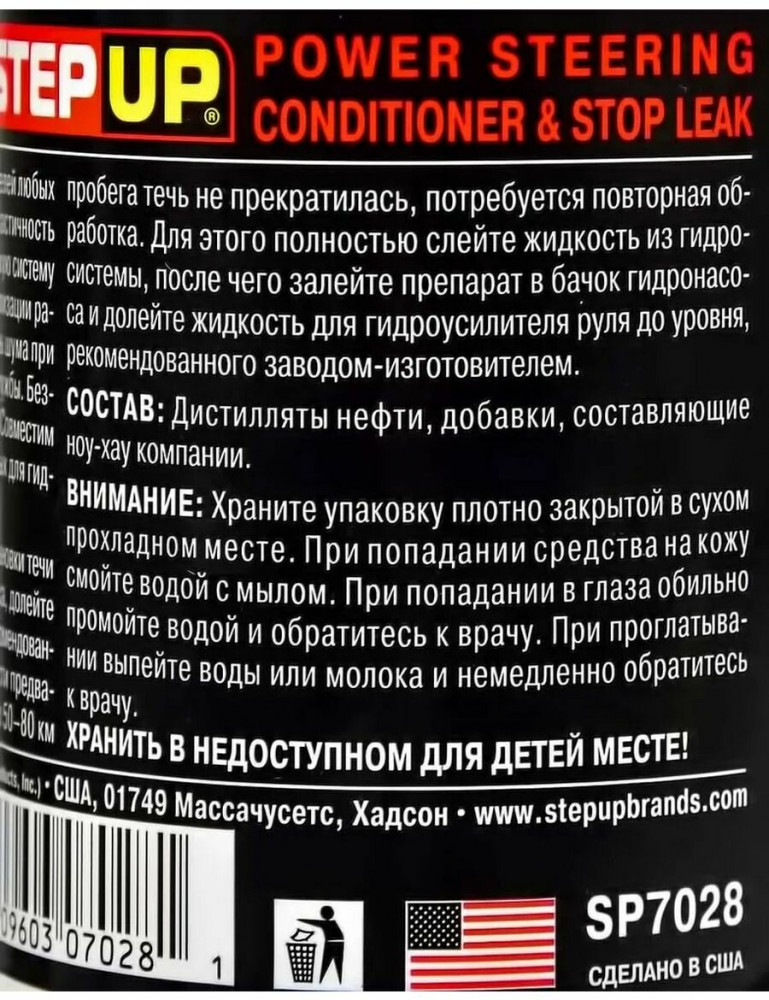 Жидкость для гидроусилителя руля Step Up c герметиком флакон — устраняет течи гидроусилителей любых конструкций. Восстанавливает размер и эластичность сальников и прокладок. Очищает гидравлическую систему и перепускные клапаны, восстанавливает нормальную работу гидронасоса и гидроусилителя руля. Продлевает срок службы гидроусилителя, понижает шумность его работы. Безопасен для резиновых и пластиковых деталей.