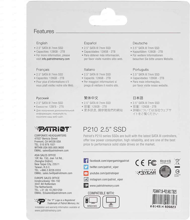 SSD-накопитель Patriot Memory P210 [P210S1TB25] — внутреннее запоминающее устройство, обладающее достаточно большой вместимостью и надежностью в эксплуатации. Благодаря объему 1024 ГБ накопитель позволяет безопасно хранить довольно большое количество различных файлов. Максимальная скорость в режиме последовательного чтения составляет 520 Мбайт/сек, а подключение накопителя осуществляется посредством интерфейса SATA III. Установка накопителя Patriot Memory P210 [P210S1TB25] ускорит загрузку приложений и увеличит производительность системы в целом. Поддержка TRIM, технология SMART и время наработки на отказ 2 млн часов подчеркивают стабильность и надежность SSD.