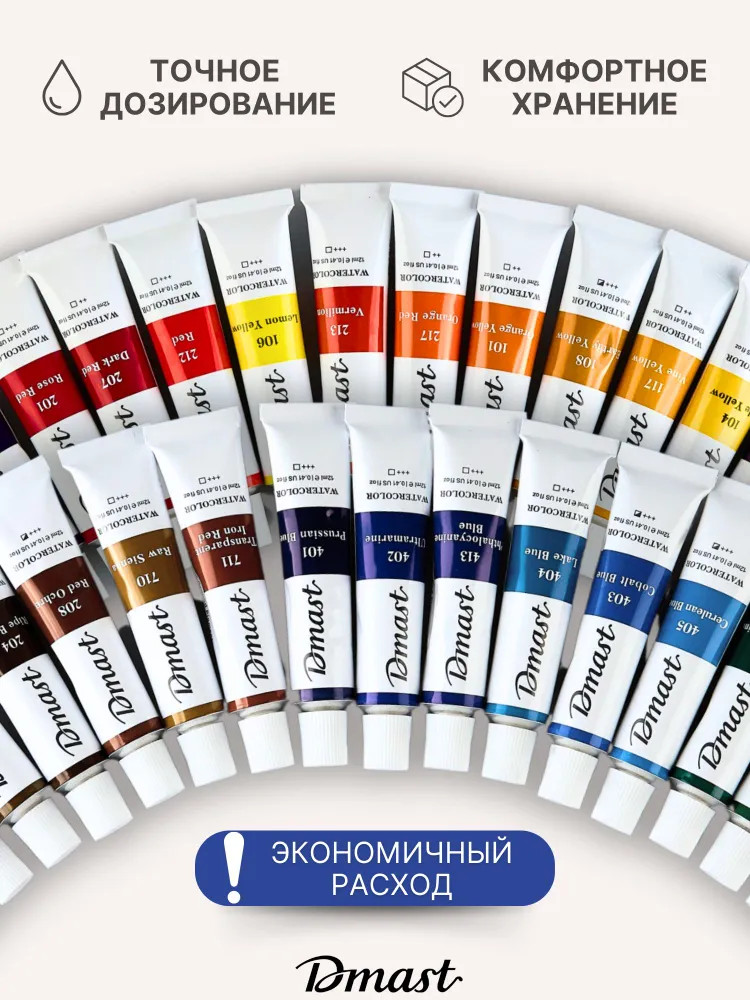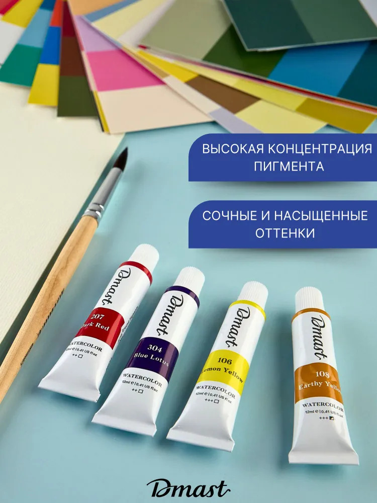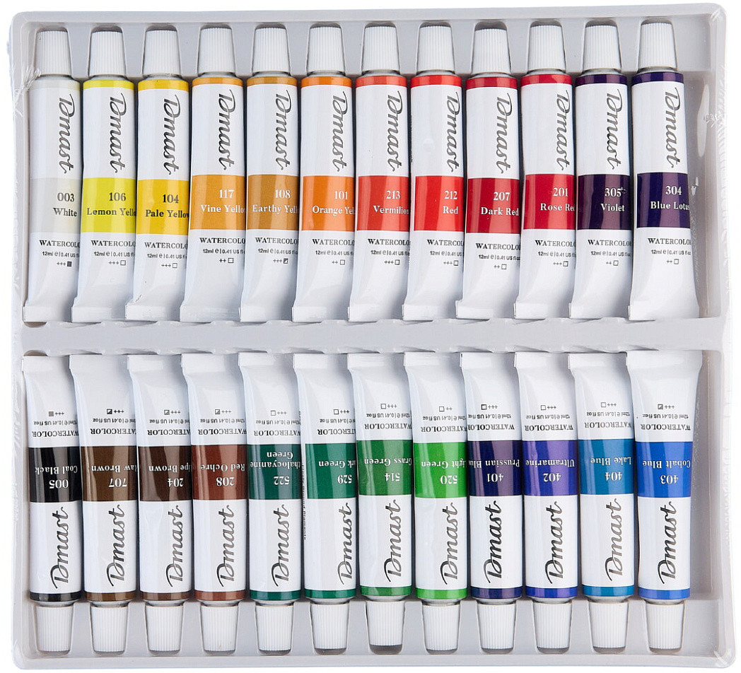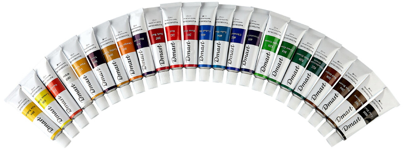 Акварельные краски Dmast имеют насыщенные чистые цвета благодаря высокой концентрации профессиональных светостойких пигментов тонкого помола. Цвета и оттенки не теряют глубину после высыхания. Отлично смешиваются и равномерно растекаются по текстуре бумаги. Акварель в металлических тубах ёмкостью 12 мл с удобно открывающимися крышками.
