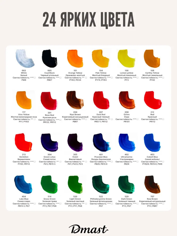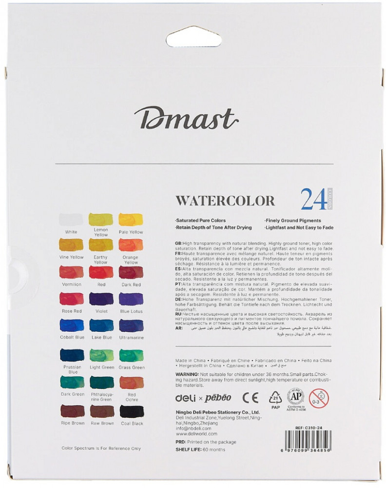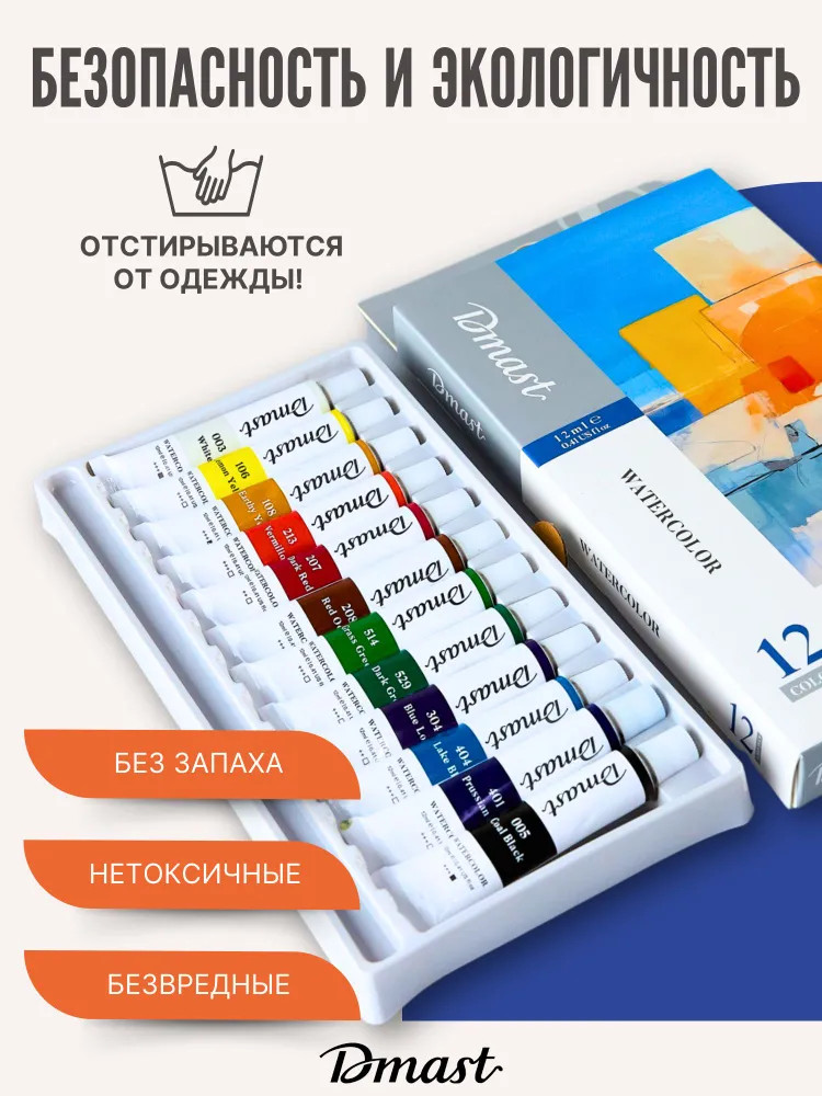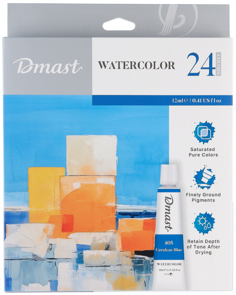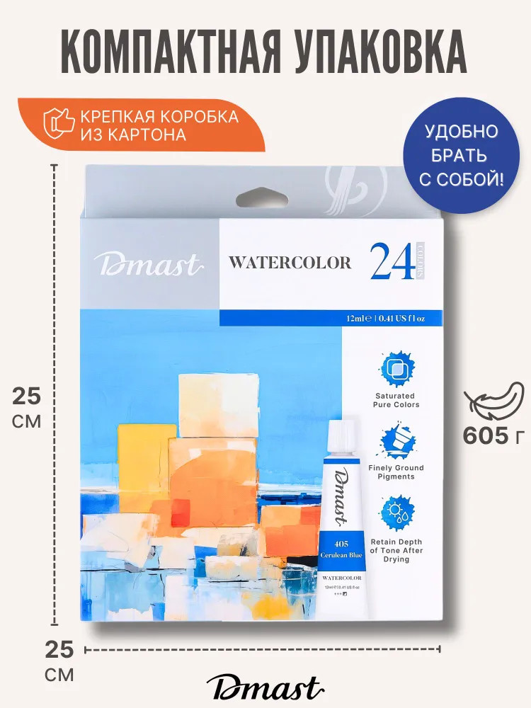 Акварельные краски Dmast имеют насыщенные чистые цвета благодаря высокой концентрации профессиональных светостойких пигментов тонкого помола. Цвета и оттенки не теряют глубину после высыхания. Отлично смешиваются и равномерно растекаются по текстуре бумаги. Акварель в металлических тубах ёмкостью 12 мл с удобно открывающимися крышками.