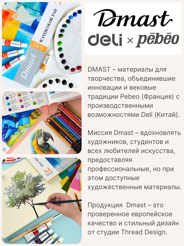 Бренд материалов для художников и творчества Dmast создан ведущей мировой компанией в области культуры и креативных технологий — Deli Group и французским производителем красок с более чем вековой историей — France Pébéo. Dmast фокусируется на исследованиях, разработке, производстве и продаже профессиональных материалов для живописи. Миссия Dmast — создавать стильные художественные материалы превосходного качества для художников, студентов, новичков и любителей творчества. Благодаря...