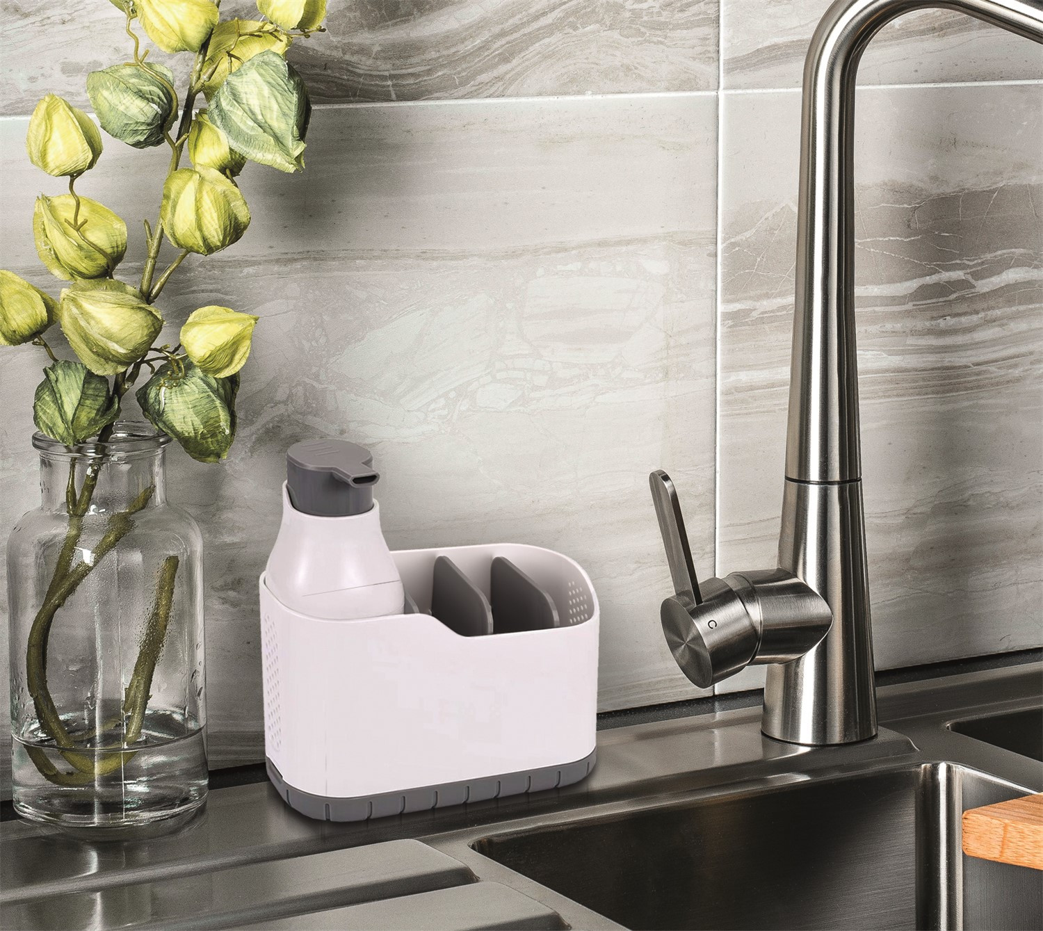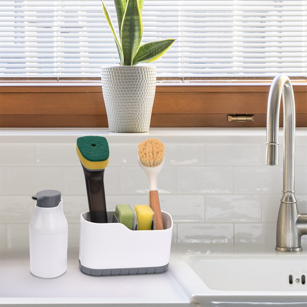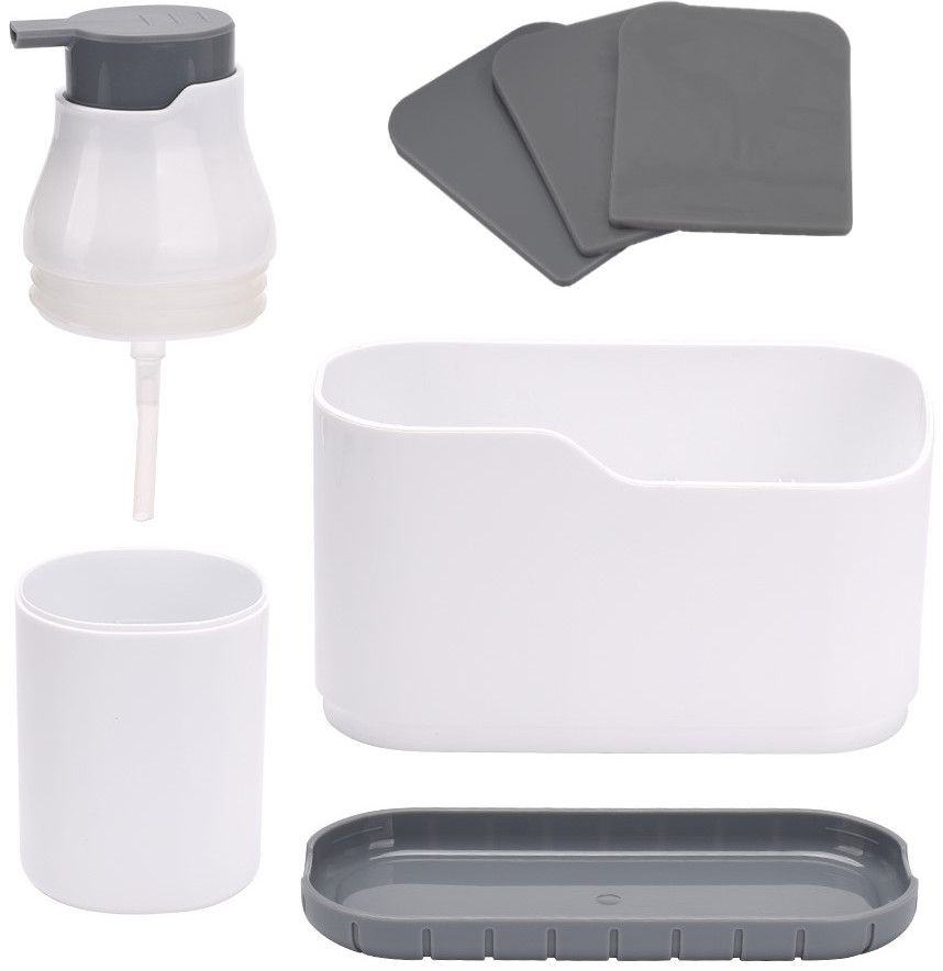 Набор с диспенсером изготовлен из высокопрочного пластика. Кухонный органайзер прост в уходе, его продуманная сборная конструкция и слив для воды делают использование легким. Этот набор создан, чтобы упростить вашу жизнь: три отсека для кухонных аксессуаров помогут навести порядок на рабочем месте, а вспенивающий дозатор и небольшой расход моющего средства сэкономят ваше время и ресурсы. Преимущества набора для кухни и ванной не ограничиваются его функциональностью. Лаконичный дизайн органайзера добавит стиля вашему интерьеру, этот органайзер станет незаменимым помощником в вашем доме. Выбирайте качество, функциональность и стиль с нашим набором, который состоит из диспенсера и отсеками для хранения — пусть ваша кухня или ванная наполнятся еще большим уютом и порядком.