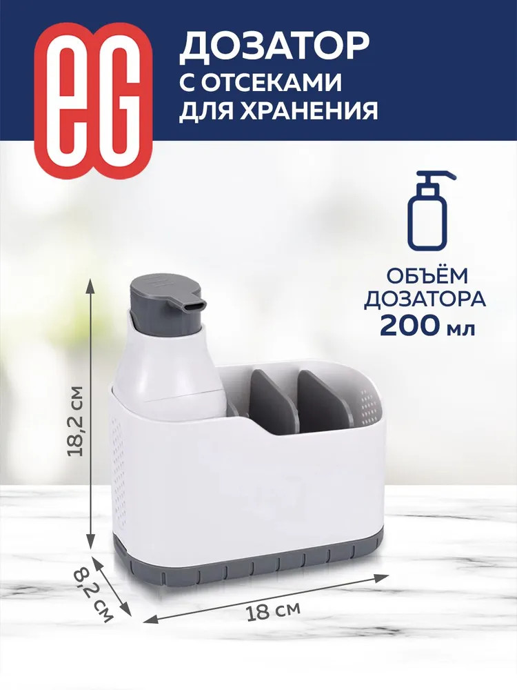Набор с диспенсером и отсеками для хранения — это отличное решение для тех, кто ценит функциональность и порядок. Благодаря компактному размеру 18,2×8,2×18 см органайзер станет незаменимым помощником как на кухне, так и в ванной комнате. Стильный кухонный набор подходит для жидкого мыла или моющего средства. Дозатор объемом 200 мл с помощью плавного механизма нажатия на диспенсер легко вспенивает содержимое и делает его использование максимально удобным.