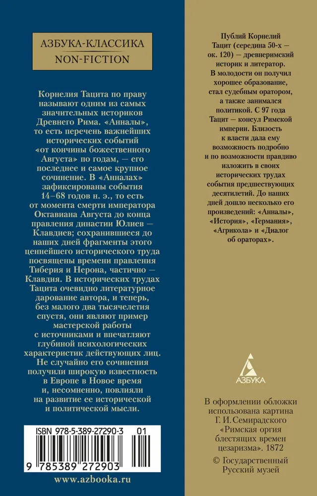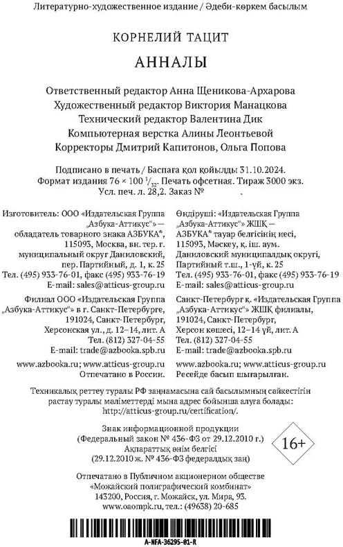 💳 Оплатить за товар можно при получении 🇰🇿 Есть бесплатная доставка по Казахстану от 1 дня 🎁 Копите бонусы с каждой покупки Серия: Азбука-Классика. Non-Fiction Корнелия Тацита по праву называют одним из самых значительных историков Древнего Рима. «Анналы», то есть перечень важнейших исторических событий «от кончины божественного Августа» по годам, — его последнее и самое крупное сочинение. В «Анналах» зафиксированы события 14-68 гг. н. э., то есть от момента смерти императора Октавиана Августа до конца правления династии Юлиев — Клавдиев; сохранившиеся до наших дней фрагменты этого ценнейшего исторического труда посвящены времени правления Тиберия и Нерона, частично — Клавдия. |