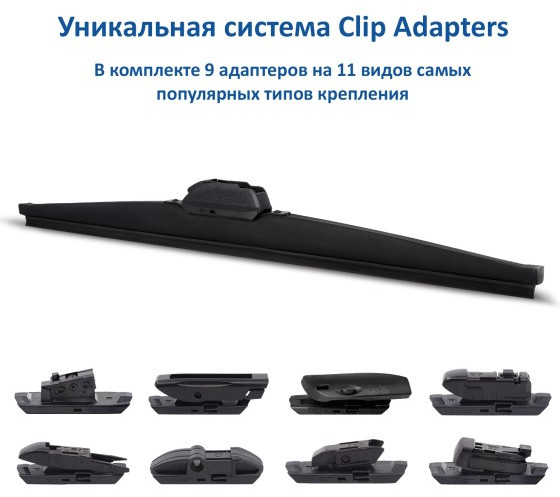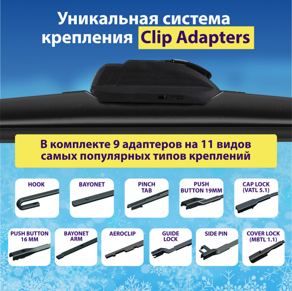 Зимняя щетка стеклоочистителя Goodyear «Winter Premium» с уникальной системой креплений Original Clip Adapters подходит на 99,8% всех моделей легковых автомобилей. В комплекте 9 адаптеров на 11 видов крепления: Hook, Side Pin, Push Button (19 mm), Pinch Tab, Bayonet, Push Button (16 mm), Guide Lock (DNTL1.1), Cap Lock (VATL5.1), Cover Lock (MBTL1.1), Bayonet ARM, AeroClip.