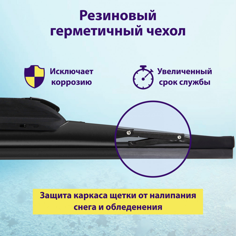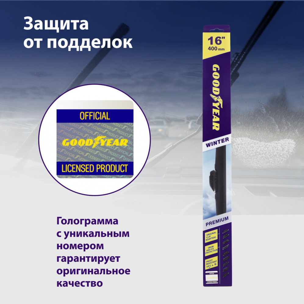 Резиновый герметичный чехол надежно защищает каркас щетки от влаги, пыли и обледенения. Вследствие этого щетка стеклоочистителя менее подвержена коррозии и имеет увеличенный ресурс. Шарнирная конструкция вне зависимости от погодных условий остается подвижной, и обеспечивает плотное прилегание лезвия по всей длине к лобовому стеклу. Каждая упаковка защищена от подделок голограммой с уникальным номером. Щетки с этим знаком — оригинальный лицензионный продукт Goodyear с гарантированно высоким качеством.