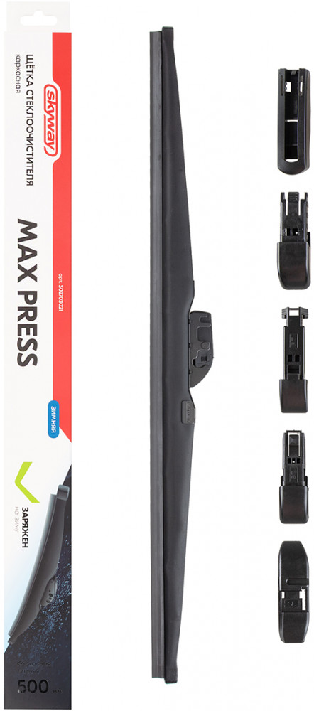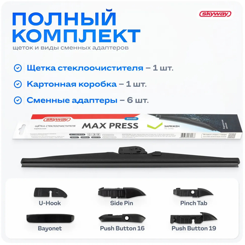 Щетка стеклоочистителя каркасная зимняя Skyway Max Press 6 адаптеров — обеспечивает плавное и легкое скольжение щеток благодаря графитовому напылению. Все подвижные элементы защищены резиновым кожухом, идеальны для суровых условий.