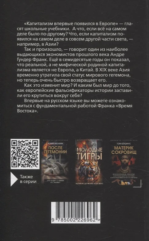 💳 Оплатить за товар можно при получении 🇰🇿 Есть бесплатная доставка по Казахстану от 1 дня 🎁 Копите бонусы с каждой покупки Серия: Шахматы геополитики «Капитализм впервые появился в Европе» — гласят школьные учебники. А что, если всё на самом деле было по-другому? Что, если капитализм появился на самом деле в совсем другой части света, например, в Азии? |