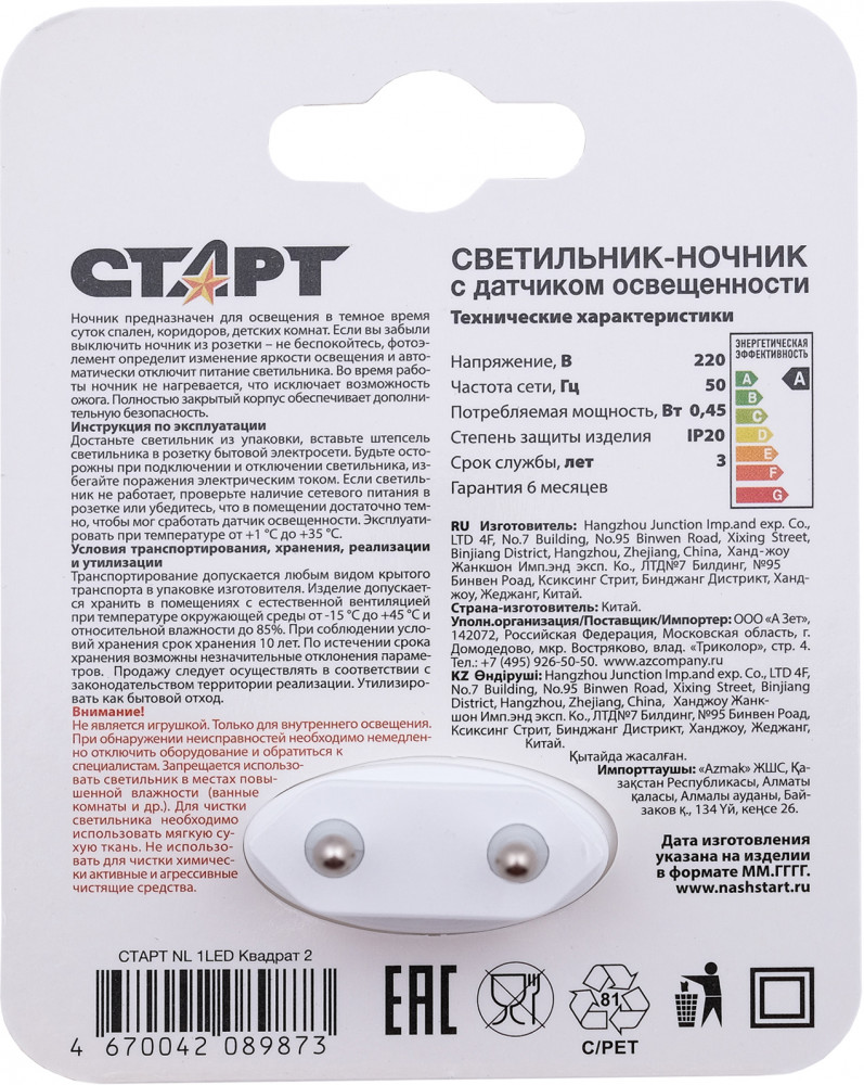 Светодиодные светильники отличаются низким энергопотреблением и продолжительным сроком службы. Способны работать до 25 000 часов. Ночники Старт NL 1LED — это стопроцентная безопасность. Прочный корпус, из приятного наощупь ABS пластика, который не нагреваетсяется. Вредные вещества отсутствуют полностью.