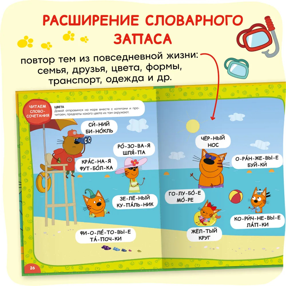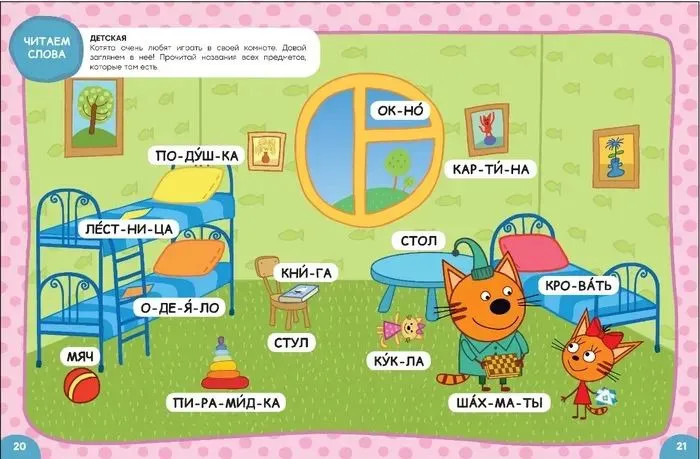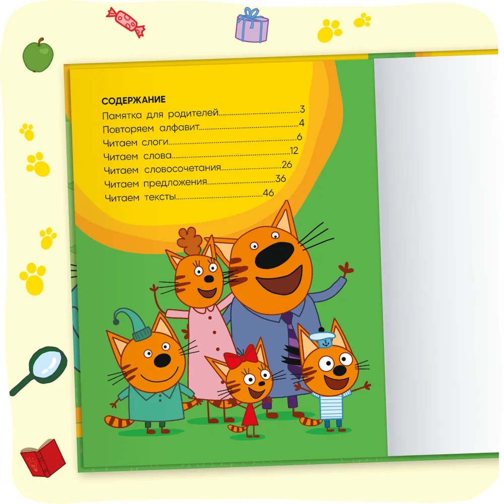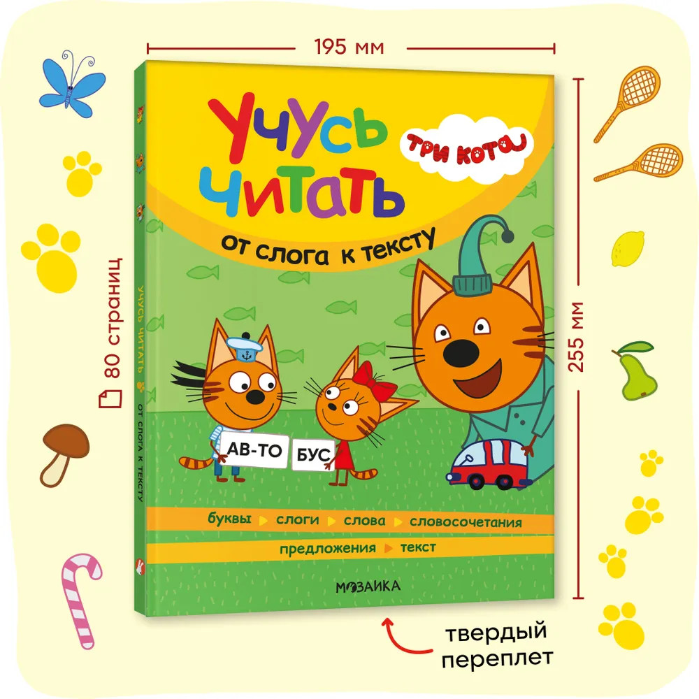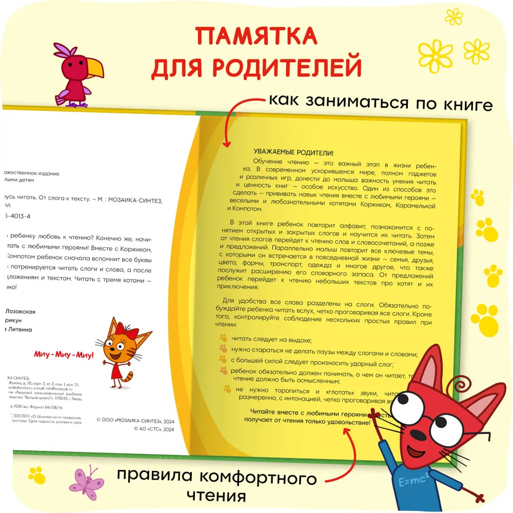 💳 Оплатить за товар можно при получении 🇰🇿 Есть бесплатная доставка по Казахстану от 1 дня 🎁 Копите бонусы с каждой покупки Книга «Три кота. Учусь читать. От слога к тексту» — настоящая находка для родителей, которые хотят в игровой форме научить читать своего ребенка. Книга построена по принципу от простого к сложному: от самых азов — алфавита — к чтению сначала слогов, затем слов, словосочетаний, предложений и, наконец, небольших текстов про котят и их приключения. Параллельно малыш повторит все ключевые темы, с которыми он встречается в повседневной жизни, что также послужит расширению его словарного запаса. Для удобства чтения все слова разделены на слоги, везде проставлены ударения. И, конечно же, учиться читать гораздо веселее вместе с любимыми героями — Коржиком, Карамелькой и Компотом! |