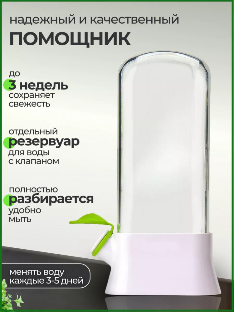 Способ применения: откройте прозрачную крышку контейнера, потянув вверх, заложите туда зелень, закройте крышку и держите емкость в вертикальном положении. Через специальный клапан залейте свежую воду, чтобы корешки находились в воде на 2-3 см. Не забывайте раз в несколько дней обновлять воду в контейнере, чтобы ваша зелень ещё дольше сохраняла свою свежесть. Также рекомендуем сливать воду перед открытием резервуара.