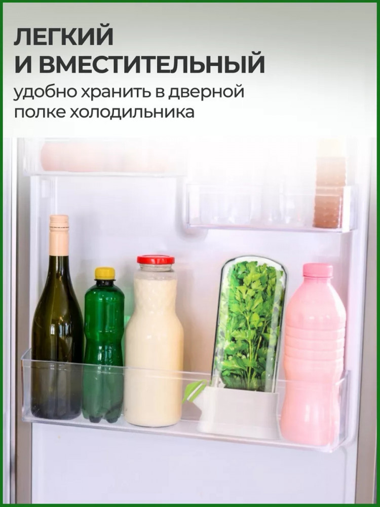 Большой объем нашего аксессуара позволит вам хранить в холодильнике сразу несколько стандартных пучков зелени или один объемный пучок салата. Такой органайзер для хранения зелени является идеальным выбором для организации пространства и порядка на кухне, так как поместится даже в дверце холодильника.