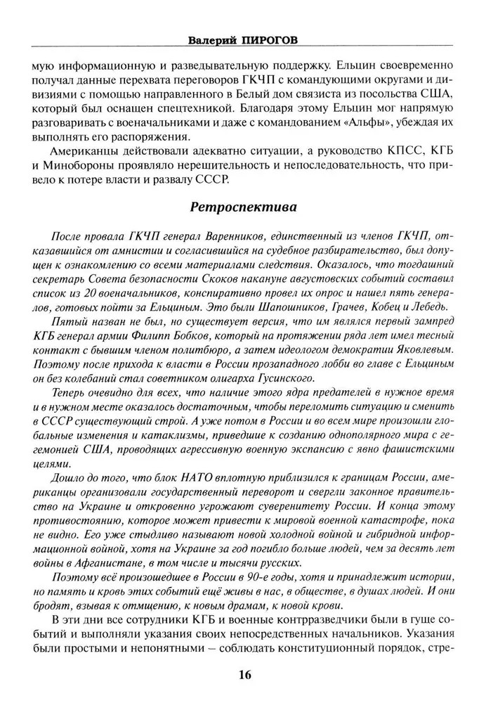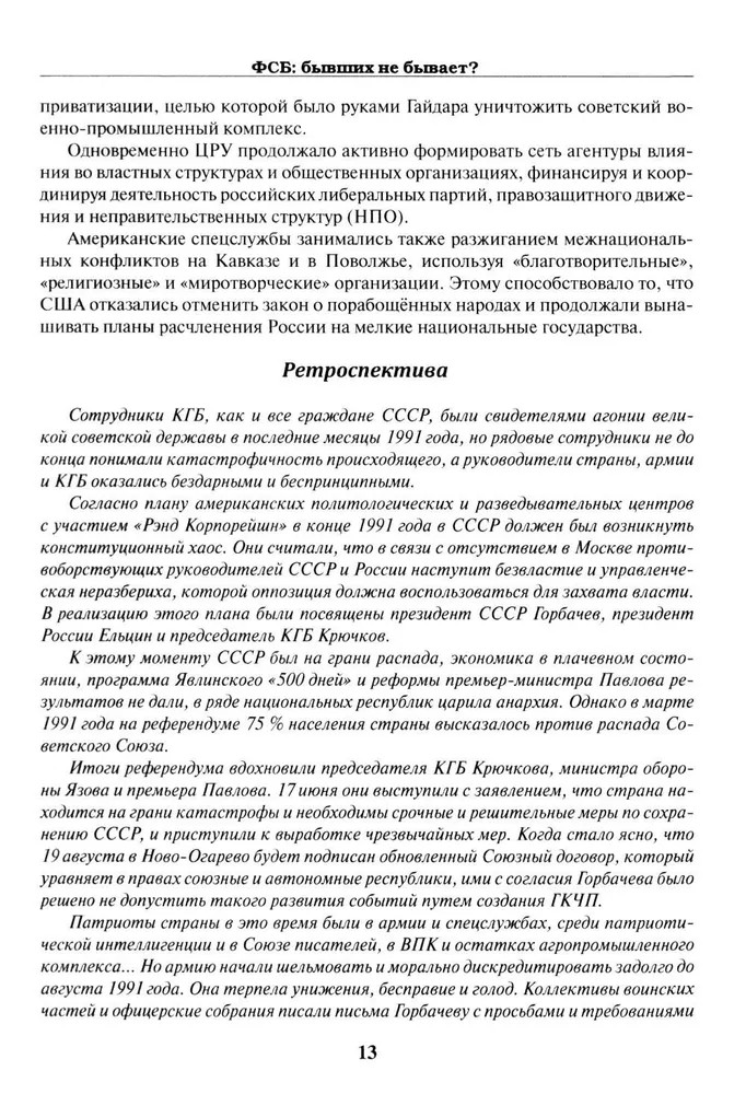 💳 Оплатить за товар можно при получении 🇰🇿 Есть бесплатная доставка по Казахстану от 1 дня 🎁 Копите бонусы с каждой покупки Серия: Отдельные издания (историческая литература) Пирогов Валерий Владимирович — ветеран ФСБ, полковник, член Союза писателей России, автор нескольких произведений прозы, поэзии и публицистики, лауреат различных премий. В 1991 г. СССР распался, и КГБ был ликвидирован. После этого части сотрудников КГБ и новому поколению разведчиков и контрразведчиков предстояло пройти сложный тернистый путь создания новых российских спецслужб. Контрразведкой стала заниматься ФСБ, а внешняя разведка обрела самостоятельность и была сконцентрирована в СВР. О судьбах уволенных из КГБ сотрудников рассказывается в документальном романе «ФСБ: бывших не бывает?». Это был путь побед и потерь, который в итоге позволил российским спецслужбам вновь обрести авторитет в народе, а противнику — испытывать страх и уважение к этим спецслужбам. Однако незримая война еще продолжается... |