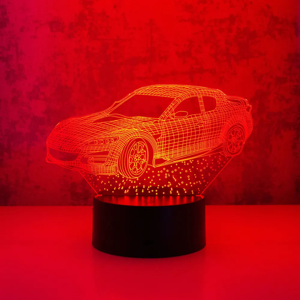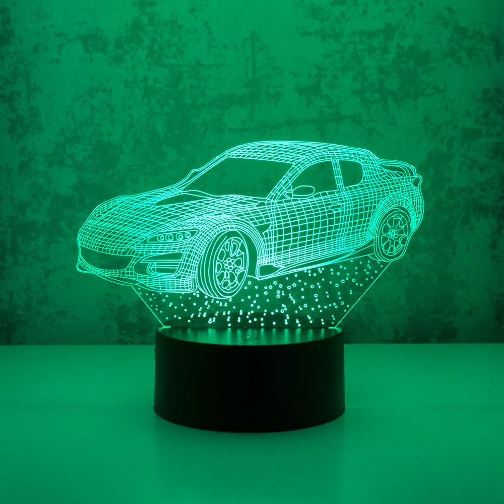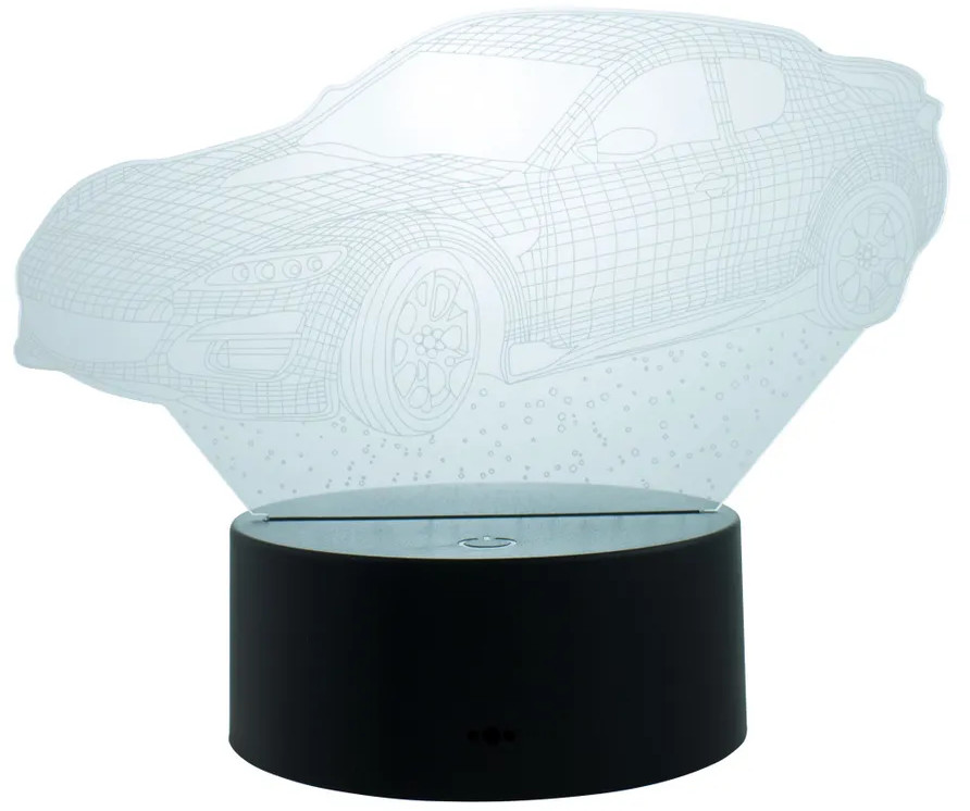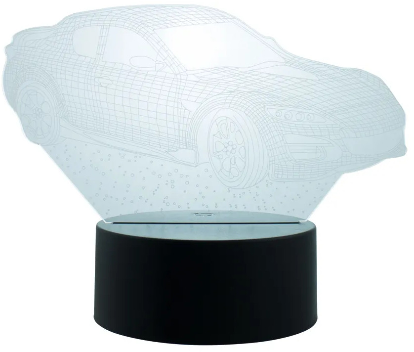 Компактный светильник на округлом основании, создающий во включенном состоянии иллюзию трёхмерного объёмного изображения мчащегося спортивного автомобиля. На основании светильника — удобная сенсорная кнопка управления, с помощью которой можно менять 7 цветов свечения. Также имеется автоматический режим, когда 3D изображение само начинает плавно переливаться разными оттенками. За счёт энергосберегающих диодов свет распространяется мягко и рассеянно. Это изделие — прекрасное средство для маленьких детей, боящихся засыпать в темноте. Свечение не будит и не раздражает.