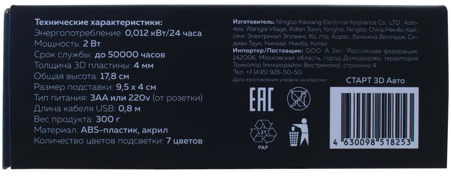 3D-светильники от компании Старт абсолютно безопасны. Изготовлены из нетоксичного сверхпрочного пластика и акрила. Не бьются при падении. Не содержат опасных примесей, не распространяют вредные излучения. Источник света — LED (светодиод), материал — ABS пластик, акрил, питание: USB кабель, батарейки (3 x ААА).